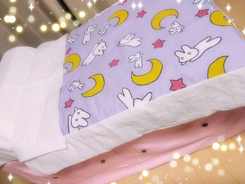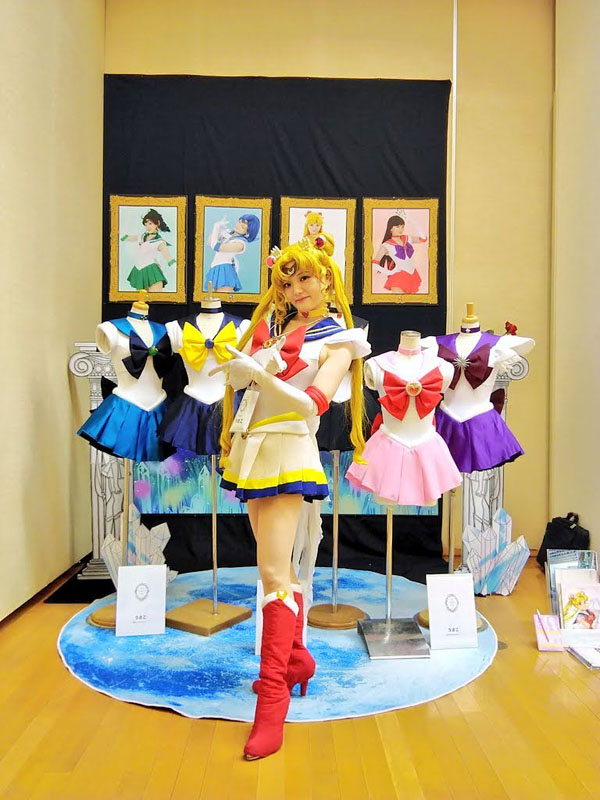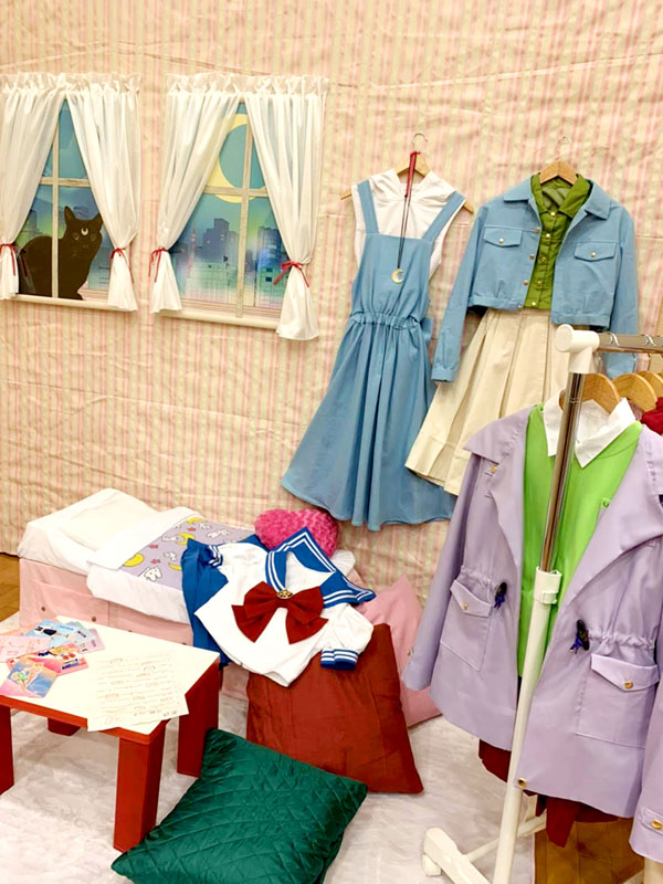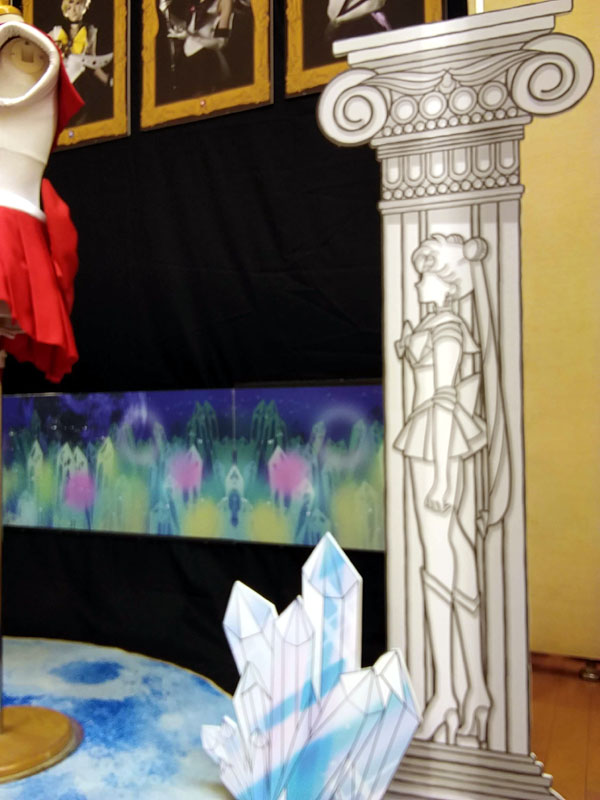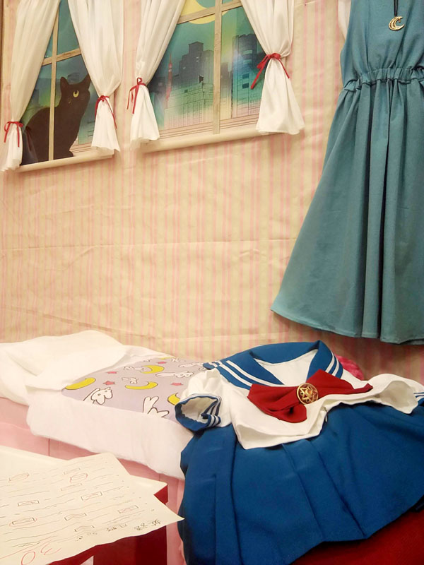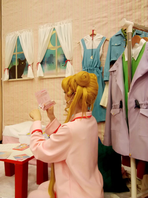 めっっっちゃ楽しい二日間でした! 緊急事態宣言直前の日程になってしまいましたが、何事もなく開催されてありがたかったです この情勢でイベントも二年は行けていなかったし、久々の生で感じる熱量にただひたすら感動 毎年素晴らしい舞台をご用意くださるコスナビ様へ多大なる感謝を! そんな訳で軽く当日のレポです 当方は今回で二年目の参加、一年目は様子見も兼ねて大人しめに ムーンとセレニティを飾るくらいにしておいたのですが 会場の様子を拝見して、「あ、もっとマニアックにやっても大丈夫そうだ……」 と把握したので今年は全力で突っ走ってみました うさぎちゃんの部屋、到来 写真展なのに写真を飾らないという概念ぶち壊しの案件です 部屋を作りたいとお伝えしていたので少し広めの場所を頂きました ありがたい限りです 壁紙にイメージぴったりの生地を発見 こんなに太いラインの生地、うさぎちゃん部屋の壁紙以外に使い道があるのだらうか そして部屋を演出する大事な窓 今回写真の展示はないのでこの背景が唯一の壁掛け展示物です ミクさんが当時アニメの世界観をイメージして麻布十番の街並を描いてくださいました 再現度がすっげえ!東京タワーもあり、よく見るといるんですよ……薔薇の彼が そして手前のルナは実写というのがまた素晴らしい 二次元と三次元の狭間を描くというこの解釈よ 神かあなたは あ、ルナはミクさんちの猫ちゃん、みったん(♂)です ありがとうみったん! 設営の時点ではこんな感じ 正直、部屋というには色々と物足りない 奥行きが欲しい、もっと部屋らしさの演出が欲しい 家の赤い机をどうして持ってこなかったのか、マットレスも用意すればよかった そんな中途半端な部屋感になってしまったのには実は理由があり ブースの前は50cmしかせり出せない規定があったのです なのでギリギリ50cm以内にしたベッドとハンガーラックだけを持参したのですが 広めのスペースをいただいておかげで奥行きが欲しくなってしまった私 設営終わりの前日夜、明日お手伝いに来てくださるというさいこさんに 展示の未練を相談したら なんと 一晩で作ってきてくださいました うおおおおなんだこのお部屋再現度!! 簡易の机からラグマット(夜中のドンキに駆け込んでくれた)そしてクッションまで…… え、神かあなたは 神々のおかげで素晴らしい部屋展示になりました 一人では決して作り上げられなかった……支えられて感謝しかない トルソーもお借りして戦士服も一着飾らせていただきました 去年はノーマルだったので今年はスーパーセーラームーン コズミックなコンパクトも我が家の造形担当が一週間の突貫工事で頑張って仕上げました 去年は公式のアイシャドウブローチを付けていたので、ここも今年は改善した点 作りおきのレジンハート(スーパーセーラーマーズ用)に石膏で枠を固め 覚えたてのエアブラシで塗装しました さあさあ、一日目の開催だよ! 一日目はノーマルムーンでお出迎え 色々な方に熱く私服の解説をさせていただきました 特に個人的こだわりの強い6話は時間の許す限り色々な人に語らせていただきました 詳細はよければこちらをご参照ください 台本分析 セーラームーン6話「正義の味方はおじさんが好き」 月野うさぎ私服研究への道その3 ~6話衣装~ そして生のイベントならでは 他の出展者の方々との濃密なトークも醍醐味の一つ 展示の目の前でご本人に直接話を伺えるこの貴重な時間よ レアレアワークスさんのブースのどでかい槍を持たせてもらったり 支え方を享受いただき頑張っているムーン 重い、めっちゃ重い 一体普段はどう収納しているかと伺ったら 部屋に立てかけているとのこと 想像したらすっげえ部屋だ(あんたも人のこと言えねえ) ムーンティアラアクション! テクノアルタさんのブースのプロジェクションマッピング 去年はコロナで残念ながら拝見できなかったので今年楽しみにしていました 実はこれの為に合うかなと思って戦士服ムーンを持っていった人 動きに連動して技が発動するの すっげえ! 5歳くらいのちっちゃい少年たちがめちゃ頑張って技を出しているシーンに遭遇し あまりの可愛さに死ぬかと思ったマイメモリー 何て贅沢な遊びでしょう 他にもたくさんの出展者の方々から濃いお話が伺えて 本当に素晴らしいひと時でした いやもうホント、見渡す限りばかりおもしろい人たちばかりで ここに来ると安心するんですよ……もっと馬鹿やっていいですかね(イイデスヨー うさぎちゃん部屋が嬉しすぎて今日はここに泊まりたいと言いはる人 いやもうそれどころか、ここに住民票移すとか言い出す人 そんなうさこ氏が二日目に向かい更に突っ走り出します RのED乙女のポリシー並に全力疾走しちゃうよ!! 二日目 行動展示なう 自らが展示物となり、部屋の中でくつろいでいました 展示の中でくつろぐとか、どんだけ写真展の概念ぶち壊す気だよこいつ だってねえ見て……この目線で見上げるとマジ部屋なんですよ テー