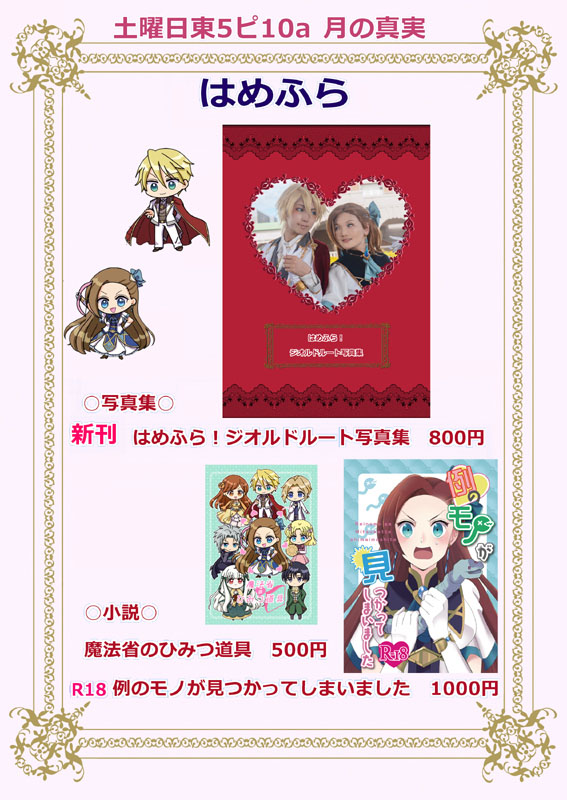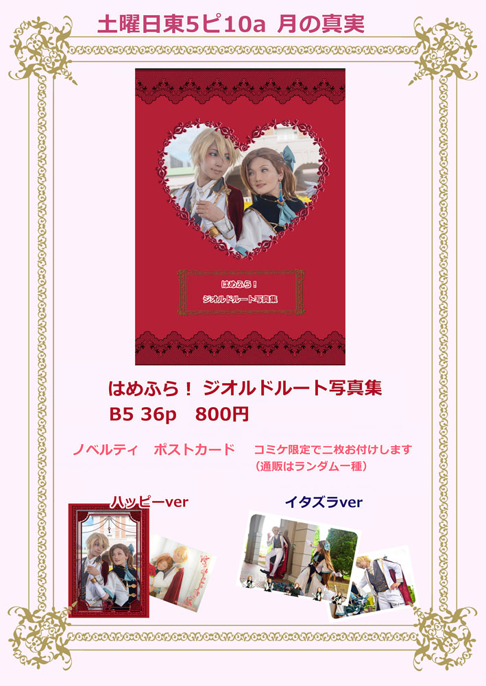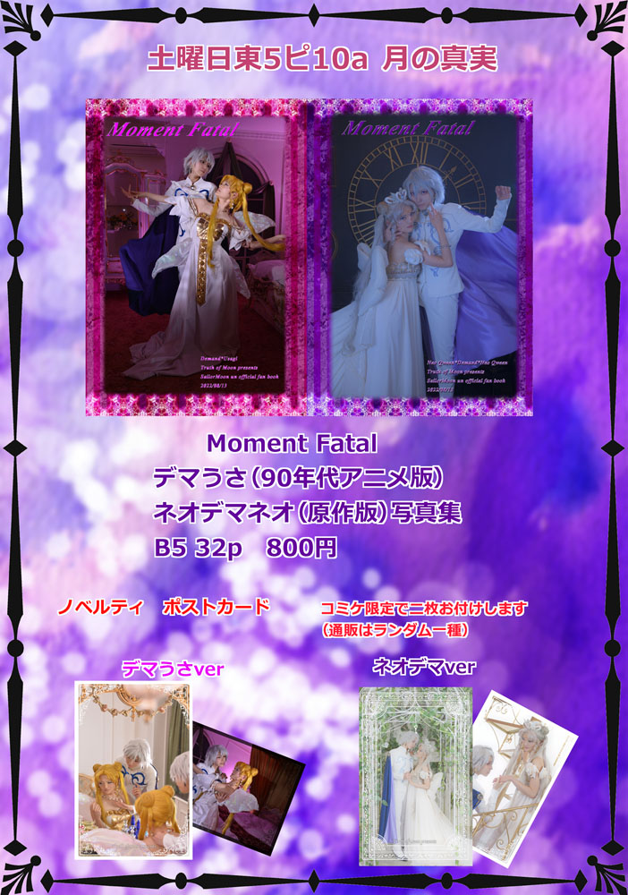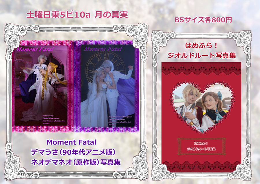今週は夏コミ原稿締切真っ只中だったので留守にしてました そして!無事!脱稿したよ!おめでとう私! そんな訳で今週は新刊の告知です コミケ一週間前に告知ってめちゃくちゃ優秀だよ!どうした私! 今回は初の二冊発行 私の二大推しカプのデマうさ(ネオデマ)とジオカタの写真集が同時に出ます!すごい私! コミケ受かってさあ何を作ろうかと一瞬悩んだのですが 丁度ジオカタの撮影が目前に控えていたので写真そのまま使って写真集作ろうと思い立ったが吉日 あれよあれよと急ピッチで仕上げて今ここです そしてジオカタの新刊出すのにセラムンの新刊がないなんて…… セラムンサークルなのにそんなの私が許さない そんな志の元、今までずっと温めていたデマうさの写真集を同時に出すことにしました マジで減ってません、足しているだけです それを有言実行してみせる そしてやりきりましたえらいワタシ 今回プリンスもジオルドさんも美弥さんでお送りしております。 中の人は同じなのにキャラと雰囲気がガラっと変わる それを同じ机の上に並べてみたい…そんな私の嗜好です あまりに温度差の激しい二冊を是非お楽しみください 以下それぞれの本の詳細とサンプルです Moment Fatal 32p 800円 こちらはデマうさ(90年代アニメ版)とネオデマネオ(原作版) 両面表紙仕様となっております 両側からジリジリと攻めていって、最後センターに熱い語りが入ります 過去美弥さんと撮影したのがアニメ版デマうさと原作版ネオデマだったというのもありますが アニメと原作の設定の差分を語るのに丁度良かった気がします デマうさの撮影は何と2015年……ひー懐かしすぎる! 2015(デマうさ)→2019(ネオデマ)→2022(ジオカタ) 二人のコスプレの軌跡を見るにも今回の二冊は興味深い…(笑) はめふら!ジオルドルート写真集 36p 800円 こちらジオカタ写真集はストーリー仕立てでお送りします 果たしてカタリナは破滅フラグを回避することができるのか……? 衣装を作り始めてからわずか二ヶ月で一冊の写真集にまで何とかこぎつけました 毎度ですが自分の勢いがコワイ…(待って逃げないでこわくないから! デマうさもジオカタもポストカード(二種)の特典が付きます コミケ限定で二種ともお付け致します。通販はランダムでどちらか一種です 通販はコミケ後にBoothにて開始します どちらの本も全力です、毎度の全力人生です! 二次元を三次元にする時にいつも二つの次元をどう繋ごうか悩まされますが 一つの目標として、絵を描かれる方の参考になったら光栄だなあと思いつつ 衣装の生地を選んだり、ポージングも指先までこだわるようにはしています なのでコスプレが地雷でなければ是非絵師さんにも手に取っていただきたい… (顔の解釈まで追いついてなくてそこは申し訳ないのですが 少しでもご興味あれば是非試しに!よろしくです!本当に!えーん!