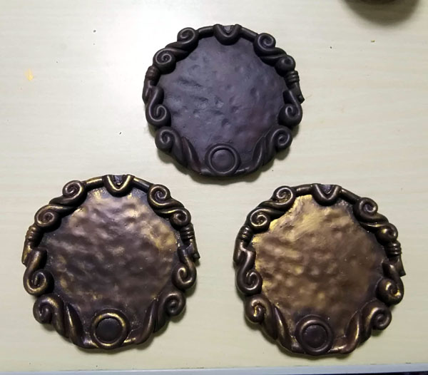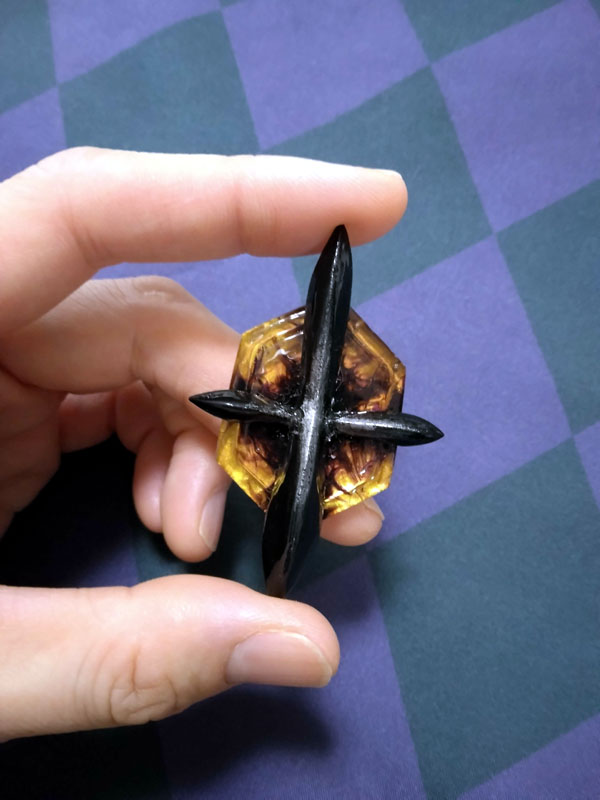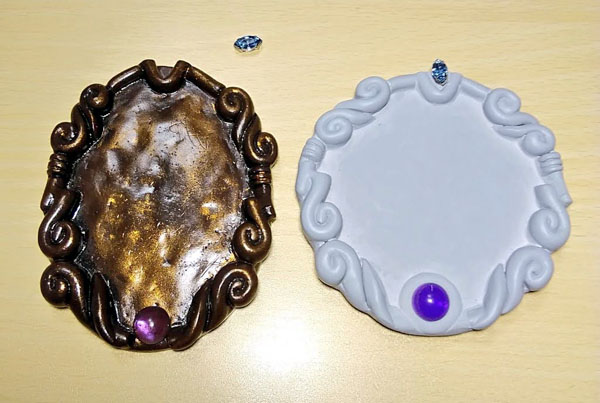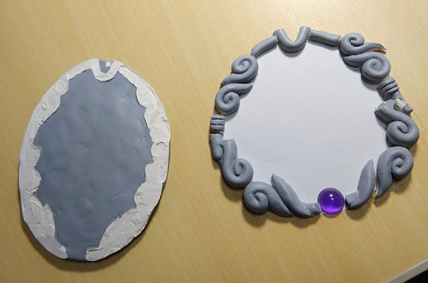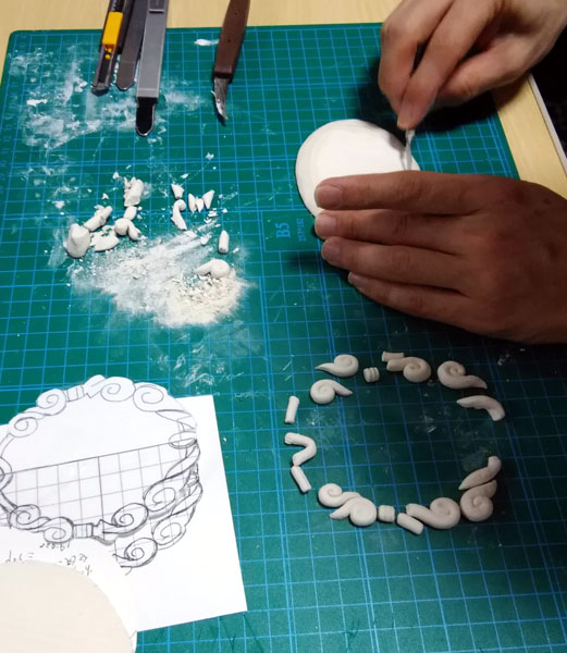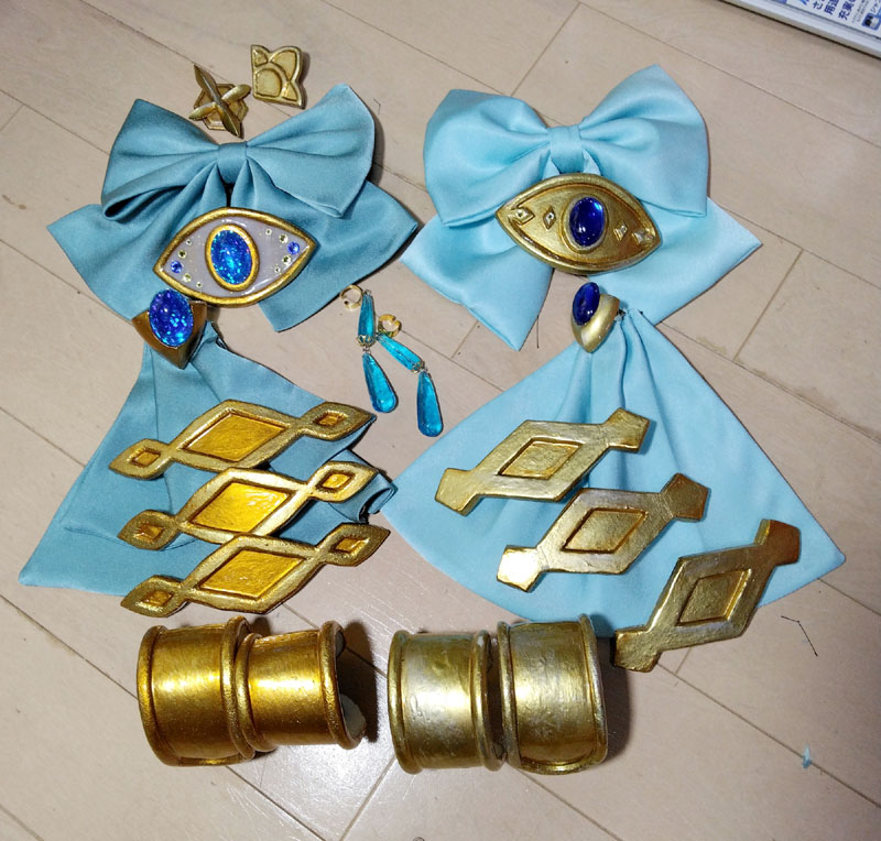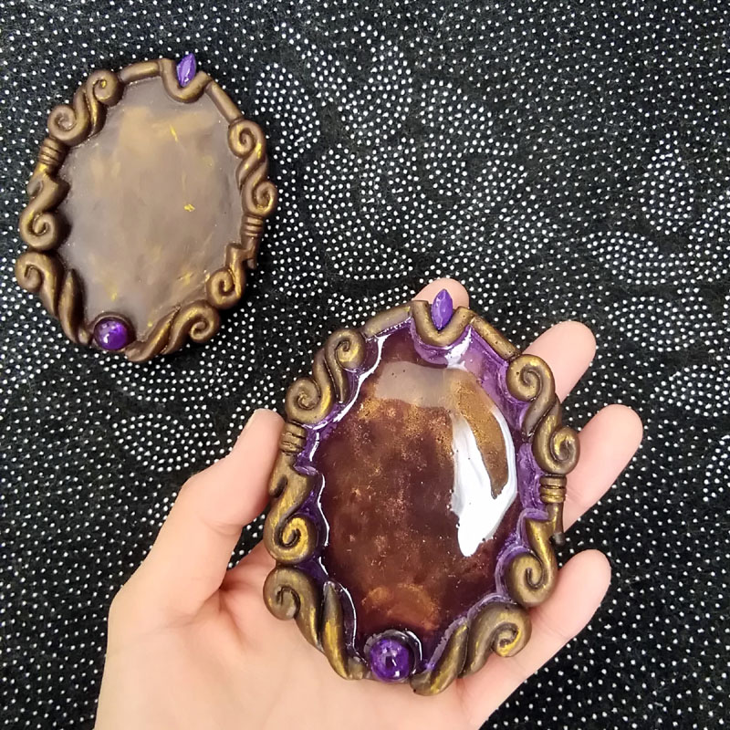 最近キャッキャしているはめふらの闇の魔法道具を作ってもらいました 先日のマイバースデーの様子 ジオルドさんに突き落とされた人の末路がここに(末路早くない!? こんな感じで昨日一昨日と、初めてのはめふらトークイベントに行って参りました すごい、なんかもうひたすらすごかった 声優さんのアドリブ力にただ感動して大爆笑しました 舞台化も楽しみです、しかも場所はサンシャイン劇場 バンミュ当時子どもで一度も行けなかったサンシャインへ 何とハメステで行く事になるという妙な縁 しかも初日はWうさぎバースデー どういうことだ! そんな近況はこれくらいにして今回の本題です カタリナがジオルドさんに町の露店買ってもらった闇の魔法道具が欲しくて欲しくて 早くこの世に形として見たかったので我が家の造型担当に頼み込んで早々に作ってもらいました ええ、衣装もまだ手つかずなのに先に小道具ができましたよ 古の闇の魔法道具―― 原作には"それは女の片手におさまるくらいの丸い形をしており、なんとなく鏡のように見えなくはないが、鏡は付いておらず円を囲うように装飾品が付いている謎の物" と表記してあります。(原作4巻参照) 真ん丸と楕円、なぜ二つあるかというと……それは下の制作過程にて詳しく あ、ちなみにこれはアニメ版を再現してあります 原作版は大体同じだけどもうちょっとゴツゴツしている感じ いつか差分を作りたい 力を発揮した時に輝く雰囲気をイメージして 紫のレジンを入れてみたらめちゃくちゃ厨二くさくなりました いつか光らせて撮影してみたい! 嗚呼早くスカートのポケットに蛇と一緒に入れたい 衣装を作りたいですそわそわそわ そんな製作過程の一部です まず原寸の平面イメージを書く これは私の仕事 それに合わせて立体を形作っていきます ここからは造形担当の仕事 ぐるっと周囲の飾りを作ったら土台づくり 古めかしい雰囲気を出すためにわざとぼこぼこにしてあります 原型ができたらシリコンで型どり 無理抜きかなと心配でしたが何とかなりました ……とここまでがっつり形にしてはたとアニメを確認 私が参考にしていた画像だと楕円に見えたのですが 後半をしっかり見るとまん丸やん…… え、まん丸なのと改めて小説読んでコミックも確認したのですが おそらくまん丸のような気がする…… いやでも楕円にも見えたりするんですよ ななめからのアングルだったのか…とも思うけど いやお手手の角度見る限り正面で持ってるよね!ちょ! 一体どうしたらいいんだ……と頭を抱えて悩んだ結末は まん丸も作るしかありませんでした(土下座 原型のパーツを分解して改めて丸くしていく作業から始める(土下座 でもほら、どちらの解釈もありやん? つまりどうせ二つ必要だったのだ うんうん うんうん……ごめん ベースの塗装をした仕上げは私の担当 ギルディングワックスでアンティーク感の光沢とハイライトを入れていきました これでグッと立体感が出る ワックス楽しい! ちなみにベースは石膏なのでめちゃくちゃ安価で何個も作れます 嬉しくて量産して友達に配り歩くやつ ウエーイ ここからも少しずつ試行錯誤をして仕上げ トップコートも光沢ありとなしのどちらも作り比較してみたりしました さあさあ次は衣装ですね がんばります 超楽しみ
