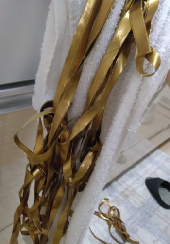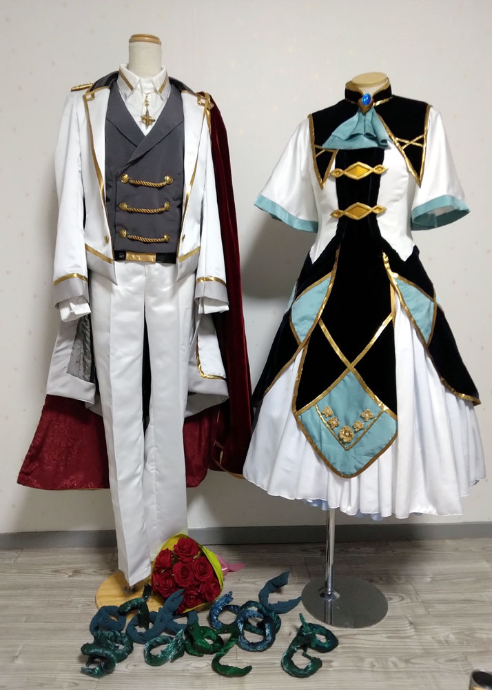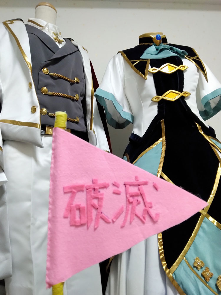 遂に我が家にやってきたよ! 早速トルソーに着せてキャッキャしました わーい!すごい!三人揃った! 立体に飾りたくてトルソーハンガーを買っておいたのですが 男性サイズはかなりいかつくて……女性サイズの衣装だと着せられるか心配だったのですが 立体部分は前半分だけなので余裕で入りました。 肩幅最高!もう一個追加で買ったので届いたらジオルドさんも着せたい どうしよう等身大の推しが部屋に並んでる…モブとして幸せな光景 いや普段からセラムン衣装飾りっぱなしではあるんですが 男の子服が並んでいるのは珍しくてとても新鮮です たまらん! 実はジオルドさんのズボンとジャケットは前回からリテイクで作り直していただきました こちらは既に二代目だったりします ジャケットの裏地のラインを前回は縫ってもらったのですが今回はプリント生地を注文 ラインの間隔も色味も原作版に合わせてデータをあしゅかさんに作ってもらい 印刷に出してしてもらいました しゅごー! そしてキースくんのダイヤ柄の裏地も合わせてプリント生地にて作成です 暗い紫の色味が綺麗に出た!裏地のこだわりすごいキースくん 撮影後に引き取ってきたのでジャケット洗濯ちう ベスト姿もラフな感じで良きですね そしてジオルドさんのマントは今回は私が作らせていただきました 一着目は衣装と合わせてオーダーしたのですが マント萌え属性の身としてはやはりマントは自分で作りたい…… ベルベット生地と裏地の薔薇柄ジャガードをまるっと買い直し (さらっと言うけど当然いい値段する) 何とか頑張って推しのマントを作ったよ! 彼マント!いいね最高だねやっほう! 製作過程 前回に引き続き金色のバイアステープをブロンドカラーにみやこ染め お料理の中にしれっと染色素材が紛れています 何回やっても簡単に綺麗に染まる……素晴らしいみやこ染め ポリエステルなので特に塩も酢も入れずに色止めなしです 白生地に縫い付けてアイロンかけるとちょっと色落ちしそうで怖い 製作途中 ベルベットすぐにしわになるので製作中はずっとトルソーにかけていたのですが もうね、マントの後ろ姿だけで存在感がすごい そこに、そこにいるのジオルドさんが マントすごい! どうしましょうプリンス・デマンドでこじらせたマント萌えの性癖が ジオルドさんで発狂までいってしまった感じがする 片側だけ肩にかけるデザインとかなんなのそれ厨二臭いでしょう ベルベットとか優雅すぎるでしょう何なのアナタ王子なの王子だった! 少し前にベルベットのミシン押さえ金を買ったのでもう手縫いなど必要ないと思っていたのですが ツルツルの裏地とベルベットの縫い合わせならそれでいけるのですが、やはりベルベット同士の 縫い合わせになるとまだ調整がうまくいかずに少しよれてしまう… 結局その部分の縫い合わせは今回も手縫いでやってしまいました カタリナ原作版ドレスのスカートと上着のフチを全部手縫いに比べれば楽勝…… マントだけで一週間かけ、大事に作りました ここからは最近作った小道具の紹介 キースくんとの併せに向けていろいろ仕込みました いでよ!土ボコ! 製作時間わずか10分!造形というより工作! そんな製作過程です 材料 紙粘土 プリンカップ(議長カタリナの小槌で使ったものをそのまま再利用)カラーサンド トップコート いち プリンカップに粘土を盛る! に 軽く表面に水溶きボンドを塗りカラーサンド(箱庭作りで使うやつ)をまぶす! (地味に二色のカラーを混ぜて自然な色味にしてあります) さん トップコートをかけて砂を固定する! おわり! 以上夏休みの自由研究土ボコの作り方でした 何だかとても大きな鈴カステラみたい 美味しそう 自由研究そのに キースくんといったらコレ 土人形ちゃん! 併せ前日にまた夜なべして5時間で作りました 何だろう異様に可愛い 普通にぬいぐるみとして愛でたい (持ち帰ったら我が息子5歳に秒で気に入られて連れさらわれていきました 作り方 原寸設計図を書いてそれぞれの長さを測り、立体にしていく のが普通の流れのようですがが 大雑把で毎度最後に帳尻合わせるワタシは結局適当に型紙を作り 手縫いで形を直していきました 計算で型を作る人すごい 感覚の魔術師にはちょっとよくわからなかった ネタをもう一つ キースくん幼少期のアレ 字の雰囲気も頑張って再現してみました 地味に現地までどう持っていこうか悩まされる小道具です(カートに畳んでギリ入った) どう使うかはお楽しみで そして毎度増えていく蛇さん 生地を変え色味を変え、地味にパターンが増えてきたよ 今回メタリックな蛇柄生地を見つけたのでよりリアルな蛇も作りました とぐろを巻かないバージョンも誕生 地味に表面のワッシャーの裁ち方を変えてます 今までのはワッシャーを横に取る?感じで作ってましたがまっすぐな子は縦で取ってます 捻るなら横の方が良さそう まっすぐなら縦の方が表面の質感よく出る 一体何の研究を始めた私よ…… こうしてどんどん進歩していく蛇作り
