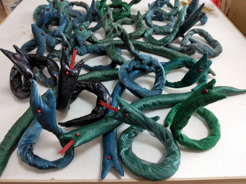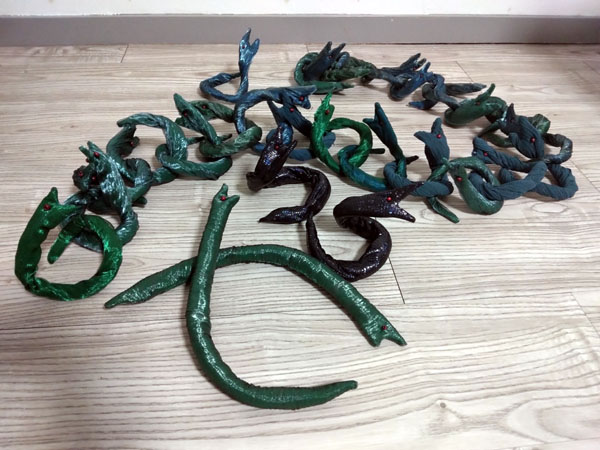 それは今年の最初に頑張って作った蛇の玩具100匹 じゃーん 数えると本当に100匹いるんですよフフフ これをXに載せる時にセンシティブなワンクッションを始めて設定してみました裏話 一体どうしてこんな所業をやったのかとご説明しますと カタリナちゃんが婚約者のジオルド王子の苦手な蛇を投げて ビビっているうちに逃走するという作戦を企て そのために幼き頃(8.9歳)からずっと完成度をあげる努力をしてきたなんて流れがあり 実は私、この蛇の玩具にいたく感銘を受けてジオカタ沼に沈んだと言っても過言ではなく だってこんなに一途に8年間も蛇を作って投げる練習までするなんてもう愛じゃないかそうだろう 制作風景もなかなかにエグイ 最後のラストスパート(今年の1月から2月)はずっとカーテンレールに蛇を並べて 毎日増えていくヘビカーテンをニヤニヤしながら眺めていました(ただの狂気 ちなみに原作小説にもコミックスにもアニメにも 特に100匹作ったとは書いてません 丁度良い区切りなのと100匹いたらド迫力だろうというやんちゃな精神で100匹作りました(ただの狂気 ここまで作るのに約3年 リアルカタリナは8歳から16歳まで約8年 その年月には敵いませんでしたがなるべく再現してみたよ!(ただの狂気 ちなみに100匹作ったと言いましたが実は私が作ったのは99匹 一匹は、はめふら仲間の竹乃さんにお願いして制作いただきました この子がもうすごい。。どこにいても分かる最高の存在感です流石すぎる ちなみに私が最後に作った蛇は本当の最終形態 自分なりに超頑張ってリアル蛇を追求した一匹 アニメ一期の最後に出てくる店頭に並んでいた蛇の玩具のイメージです 初代蛇はちゃんと紙製で作ってあります そうして何をやってきたかというと ジオルド王子(いつもの美弥さん)を召喚したジオカタ蛇対決です ムーンスパイラル♡アタック!(作品違う もうホント何やってるんだろうねこの人は いつも付き合ってくれる美弥さんとあしゅかさんとわてぃさんありがたう。。 折角だからもう一個 やってみたかったネタがコチラ ジオカタでパジャマパーティ アニメ二期で邪魔された案件 二次の妄想で補完しようとする毎度の狂気 ジオルドさんのパジャマはアニメには出てきておらず こちらは書き下ろしのアクスタグッズのパジャマシリーズからイメージを拝借しました パジャマの生地にも拘りました 王子なので適当な生地ではとても作れない 胸元の王家の紋章の刺繍は手製で出発4時間前から突貫工事で制作 ベースの黒にひたすら刺繍 もう少し時間があれば丁寧にできたのですが(クッッ これまた快くジオカタで遊んでくれた美弥さん いつもありがたうありがたう 実はパジャマの襟の金ラインのデザインが間違っていたのに仕上がってから気付く さあどこでしょう(撮影前に直した