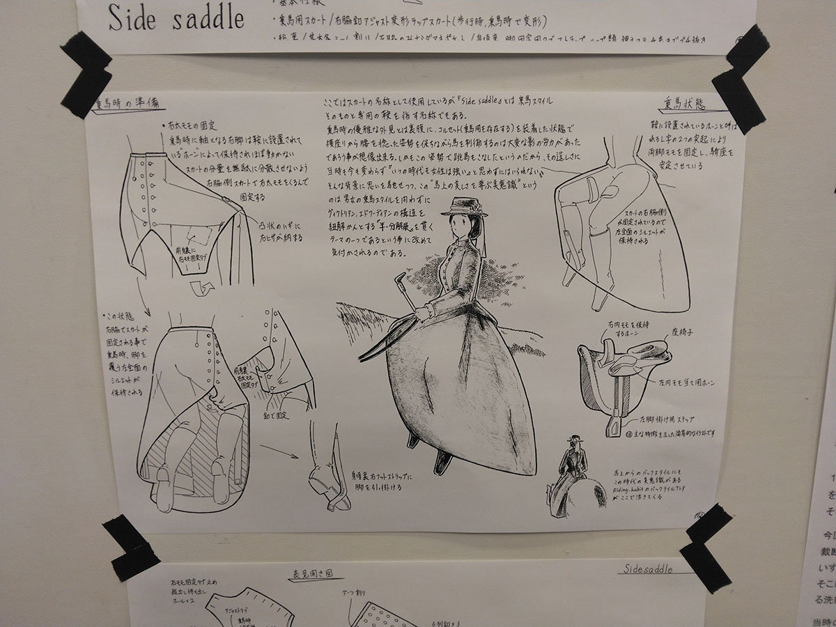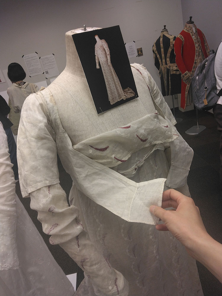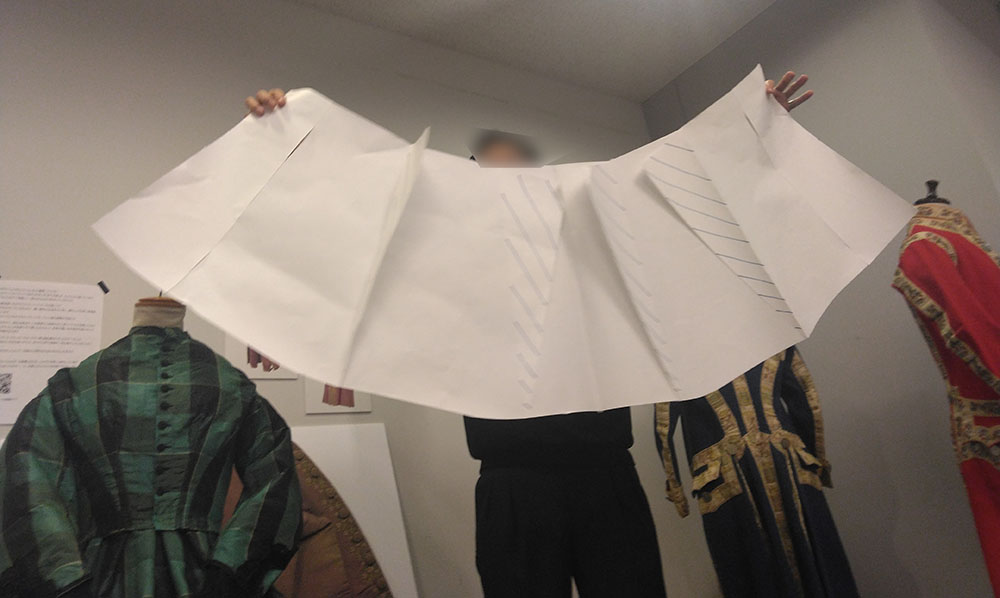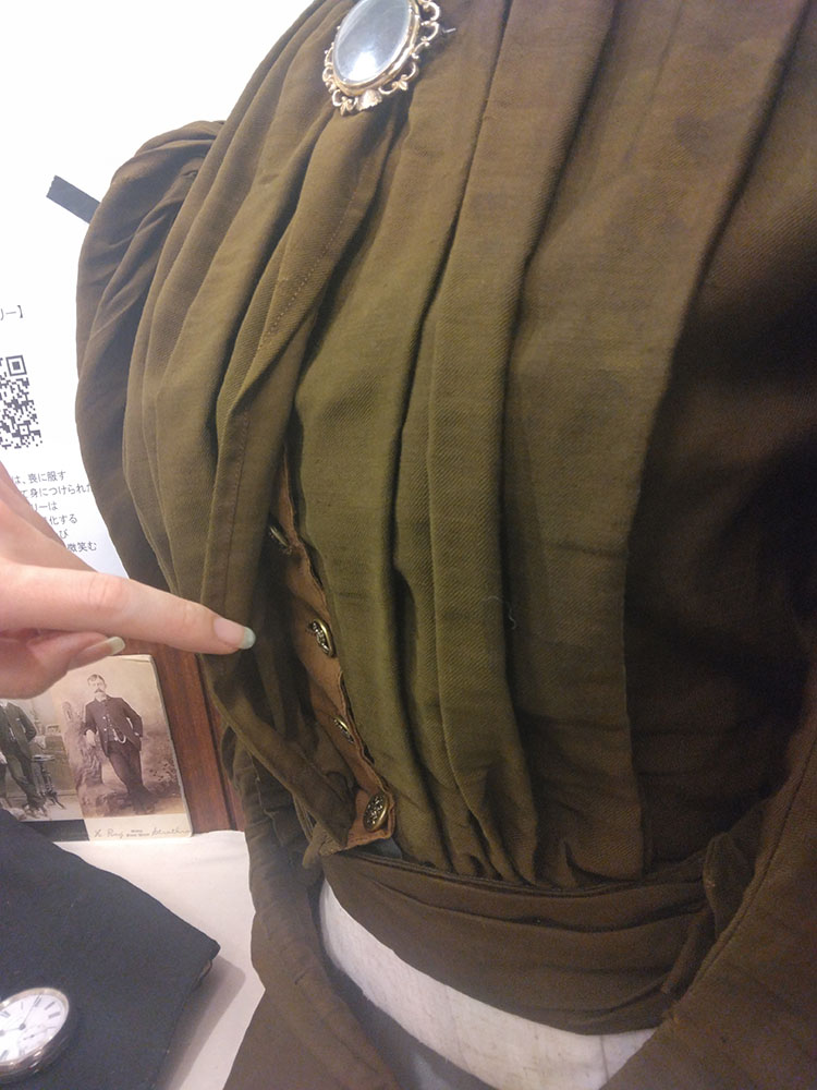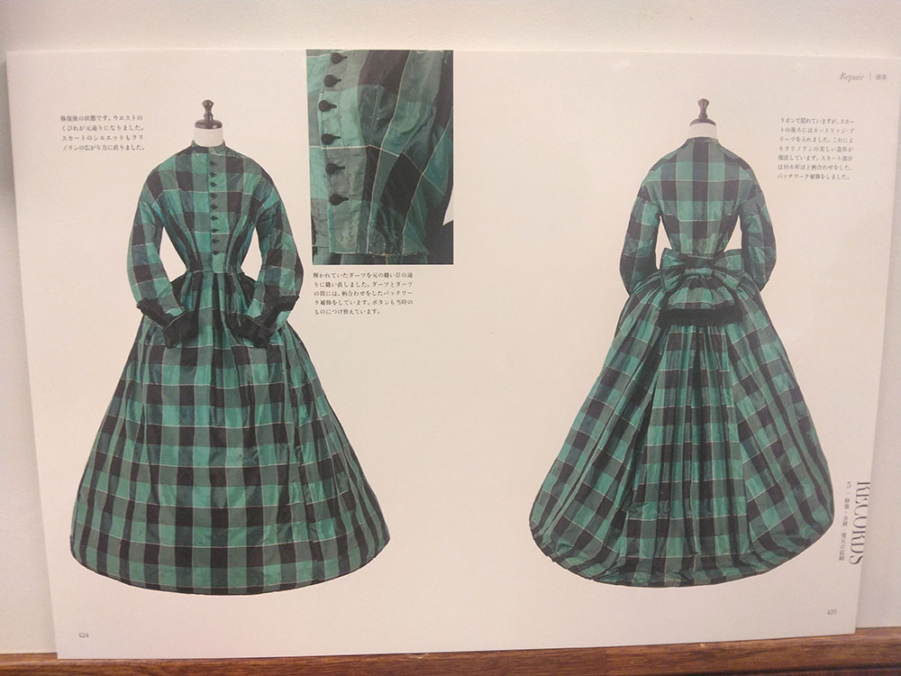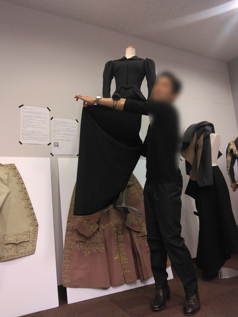 去年はヴィクトリア朝のドレスで、時代ごとの流行を一気に見られましたが 今年はDEATHファッション展ということで、危険性のあるデザインや素材のドレスから、当時の安全性を振り返る展示でこれまた超超勉強になりました (本当は去年あった下着の方も行きたかった!) 以下折りたたんでレポです。というか、自分用メモ 去年の展示のレポはこちら ※映っている人物の顔は、長谷川さん含めすべてぼかしてあります 今回のメイン サイドサドル用のドレス 女性の乗馬の、横乗りの時のドレスだそうです 19世紀末に、女性の安全性を考えて進化していったとのこと 女性が馬に跨るなんてNG、足首も絶対見せたらいけない いかに優雅な姿勢で綺麗なスカートのラインを見せるか いやカタリナちゃんがですね、馬に跨って乗る時どんな服を着たらいいのかなって そこの興味から行ったんですけど ちょっと想像斜め上まっすぐ進んでて目から鱗でした まず跨いで乗るなと、そこからだった成程! そのドレスの形がもはや謎過ぎる 何だろうこの謎のパターン スカートの内側に右膝を入れる空間があり、ストッパーまでついている つま先をストッパーに引っかけて優雅に乗りこなすようです スッゲー 完全に膝のポーズが決まっているデザイン 生地も分厚いウールのような素材で、形が一切崩れない ヒラヒラなんてご法度、セレニティ御法度!そらそうだヒラヒラしたら危ないもんな 自転車にスカートで乗ったら危ないよなワカルー! でもこの形は馬に乗っている時だけしか必要ない 降りたらもうじゃまでしかない膝部分の余白よ それを、このスカートリフターで留めるのがカッコイイ ちなみにこちらのドレスはスカートの後ろにもともとボタンが着いていて、そこに裾のフープを引っかけて持ち上げ、歩きやすくしたりするようです 他にも隠れた部分に機能性を考えた工夫が 馬に乗っている内に動けばスカートは回ってしまう それを固定するのに、スカート後ろのウエストにボタンがあり ジャケットの内側の引っかける部分とドッキングさせたりするとのこと 確か去年も飾ってあったこのサイドサドルのドレス 詳しいことがわからずスルーするしかなかったので、今回ゆっくり解説が聞けてとても良かったです どんどん進化していくサイドサドルのドレス こちらはエプロンモデルというらしく、ズボンとセットで腰に巻くタイプのスカート 馬に乗っている間は後ろの布いらなくない? ていうわけで反対側を切ってエプロンのように腰に巻く これでとても軽くなる 安全性高まる! スナップボタンも活用していて(この時代特許を取ってあるスナップボタン) 事故が起きた時も簡単に取れる仕様だそうです 18604年にサイドサドルは危ないからやめようよと記した女性の日記。 そこから40年後くらいにようやく、女性も跨って乗ろうという流れで跨るスカートが生まれる こちらがそのスカート クロスサドルスカートです ボタンを留める位置で、ズボンにもなるしスカートにもなる 何だこれすごい今でも使えるオシャレデザイン 今日はズボン、明日はスカート、気分で変えられるね! ズボン側を紺色でウラヌス、裏返してスカートにしたらネプチューン 一人でウラネプごっこ、気分はカリスマ え、作りたい誰か着ませんかね こちら去年も展示してあった、ヒ素で染色した死のドレス クリノリン時代のドレスで、長谷川さんが手に入れた時はリメイクしてあったけれど 一度解体して復元したとのこと 最高に狂ってるねとても素敵 ハラショー 1860年頃のドレス(1850年にはミシン導入してる) スカートもほぼ切らず、四角のまま上だけダーツ 巾62cm×スカート10枚 リメイクが主流だった時代、ダーツもほぼ布を切らない布が生きている時代のドレス (ダーツを切り刻むと布の死と仰っていたのが厨二病で最高オブ最高でした) 面白かったのが上身頃の解説 チェックの四角い柄の位置が左右でズレている 左右で布の天地をひっくり返している部分がある これを分かりやすく色分けして、黒は引っくり返った部分だと解説している場面です 布を極力節約する心意気よ そしてデザインとしても素敵 こちらも今回大きな見どころのうちの一つ クリノリン時代のドレスを下から覗くことができる こんなの初めてよスッゲー! フープが複雑に仕込んであります 形状記憶ビクともしない 展示の仕方がとにかく異質 半分くらい裏返してトルソーに着せているんですけど どういうこと (去年ちゃんと表の時に一度見ておいて良かったと思う現場よ) こことか特に痺れた 腰部分に徹底したボーン 絶対ここは細く固定してやるぞ覚悟しろよがひしひし伝わってくるボーン(ウエスト寸法標準46cmの世界) あとこれも興味深かった 遺髪で作ったアクセサリー 当時は死を身近で感じていた時代というのがよくわかる アッこんなところにボタン発見! 堂々と真ん中から割って着脱ですね しかもボタンもしっかり優雅 こちらも大変興味深く 長谷川さんに直接お話を伺った案件 これ