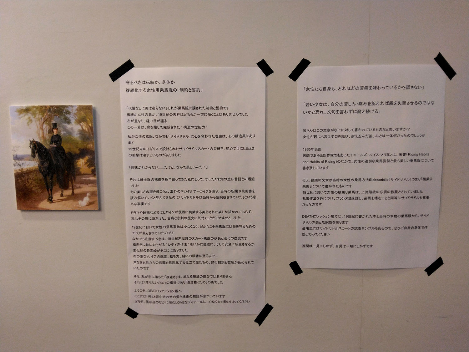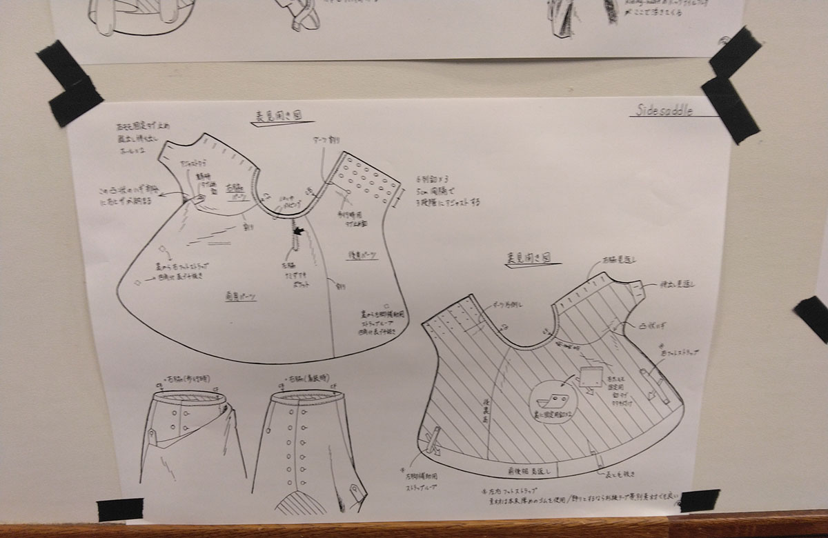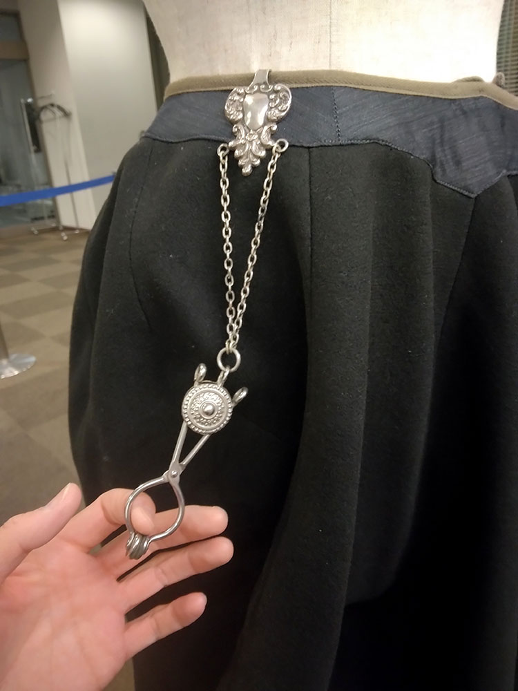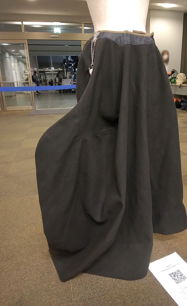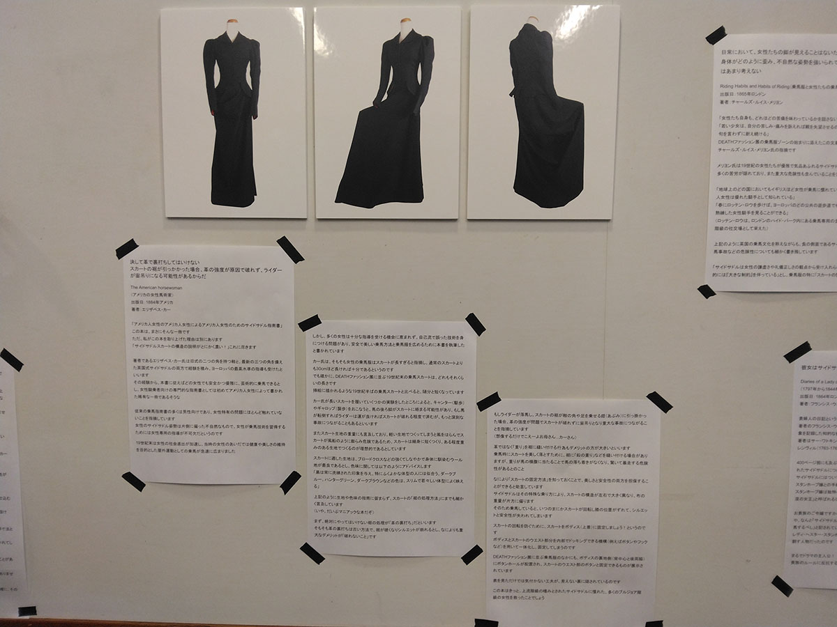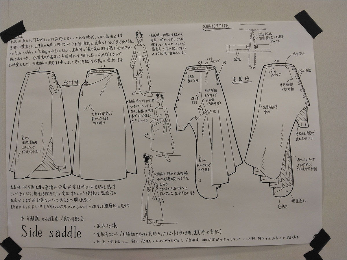 去年はヴィクトリア朝のドレスで、時代ごとの流行を一気に見られましたが 今年はDEATHファッション展ということで、危険性のあるデザインや素材のドレスから、当時の安全性を振り返る展示でこれまた超超勉強になりました (本当は去年あった下着の方も行きたかった!) 以下折りたたんでレポです。というか、自分用メモ 去年の展示のレポはこちら ※映っている人物の顔は、長谷川さん含めすべてぼかしてあります 今回のメイン サイドサドル用のドレス 女性の乗馬の、横乗りの時のドレスだそうです 19世紀末に、女性の安全性を考えて進化していったとのこと 女性が馬に跨るなんてNG、足首も絶対見せたらいけない いかに優雅な姿勢で綺麗なスカートのラインを見せるか いやカタリナちゃんがですね、馬に跨って乗る時どんな服を着たらいいのかなって そこの興味から行ったんですけど ちょっと想像斜め上まっすぐ進んでて目から鱗でした まず跨いで乗るなと、そこからだった成程! そのドレスの形がもはや謎過ぎる 何だろうこの謎のパターン スカートの内側に右膝を入れる空間があり、ストッパーまでついている つま先をストッパーに引っかけて優雅に乗りこなすようです スッゲー 完全に膝のポーズが決まっているデザイン 生地も分厚いウールのような素材で、形が一切崩れない ヒラヒラなんてご法度、セレニティ御法度!そらそうだヒラヒラしたら危ないもんな 自転車にスカートで乗ったら危ないよなワカルー! でもこの形は馬に乗っている時だけしか必要ない 降りたらもうじゃまでしかない膝部分の余白よ それを、このスカートリフターで留めるのがカッコイイ ちなみにこちらのドレスはスカートの後ろにもともとボタンが着いていて、そこに裾のフープを引っかけて持ち上げ、歩きやすくしたりするようです 他にも隠れた部分に機能性を考えた工夫が 馬に乗っている内に動けばスカートは回ってしまう それを固定するのに、スカート後ろのウエストにボタンがあり ジャケットの内側の引っかける部分とドッキングさせたりするとのこと 確か去年も飾ってあったこのサイドサドルのドレス 詳しいことがわからずスルーするしかなかったので、今回ゆっくり解説が聞けてとても良かったです どんどん進化していくサイドサドルのドレス こちらはエプロンモデルというらしく、ズボンとセットで腰に巻くタイプのスカート 馬に乗っている間は後ろの布いらなくない? ていうわけで反対側を切ってエプロンのように腰に巻く これでとても軽くなる 安全性高まる! スナップボタンも活用していて(この時代特許を取ってあるスナップボタン) 事故が起きた時も簡単に取れる仕様だそうです 18604年にサイドサドルは危ないからやめようよと記した女性の日記。 そこから40年後くらいにようやく、女性も跨って乗ろうという流れで跨るスカートが生まれる こちらがそのスカート クロスサドルスカートです ボタンを留める位置で、ズボンにもなるしスカートにもなる 何だこれすごい今でも使えるオシャレデザイン 今日はズボン、明日はスカート、気分で変えられるね! ズボン側を紺色でウラヌス、裏返してスカートにしたらネプチューン 一人でウラネプごっこ、気分はカリスマ え、作りたい誰か着ませんかね こちら去年も展示してあった、ヒ素で染色した死のドレス クリノリン時代のドレスで、長谷川さんが手に入れた時はリメイクしてあったけれど 一度解体して復元したとのこと 最高に狂ってるねとても素敵 ハラショー 1860年頃のドレス(1850年にはミシン導入してる) スカートもほぼ切らず、四角のまま上だけダーツ 巾62cm×スカート10枚 リメイクが主流だった時代、ダーツもほぼ布を切らない布が生きている時代のドレス (ダーツを切り刻むと布の死と仰っていたのが厨二病で最高オブ最高でした) 面白かったのが上身頃の解説 チェックの四角い柄の位置が左右でズレている 左右で布の天地をひっくり返している部分がある これを分かりやすく色分けして、黒は引っくり返った部分だと解説している場面です 布を極力節約する心意気よ そしてデザインとしても素敵 こちらも今回大きな見どころのうちの一つ クリノリン時代のドレスを下から覗くことができる こんなの初めてよスッゲー! フープが複雑に仕込んであります 形状記憶ビクともしない 展示の仕方がとにかく異質 半分くらい裏返してトルソーに着せているんですけど どういうこと (去年ちゃんと表の時に一度見ておいて良かったと思う現場よ) こことか特に痺れた 腰部分に徹底したボーン 絶対ここは細く固定してやるぞ覚悟しろよがひしひし伝わってくるボーン(ウエスト寸法標準46cmの世界) あとこれも興味深かった 遺髪で作ったアクセサリー 当時は死を身近で感じていた時代というのがよくわかる アッこんなところにボタン発見! 堂々と真ん中から割って着脱ですね しかもボタンもしっかり優雅 こちらも大変興味深く 長谷川さんに直接お話を伺った案件 これ