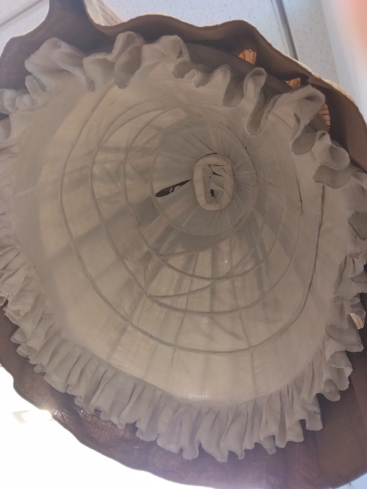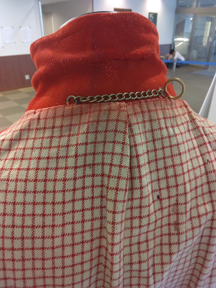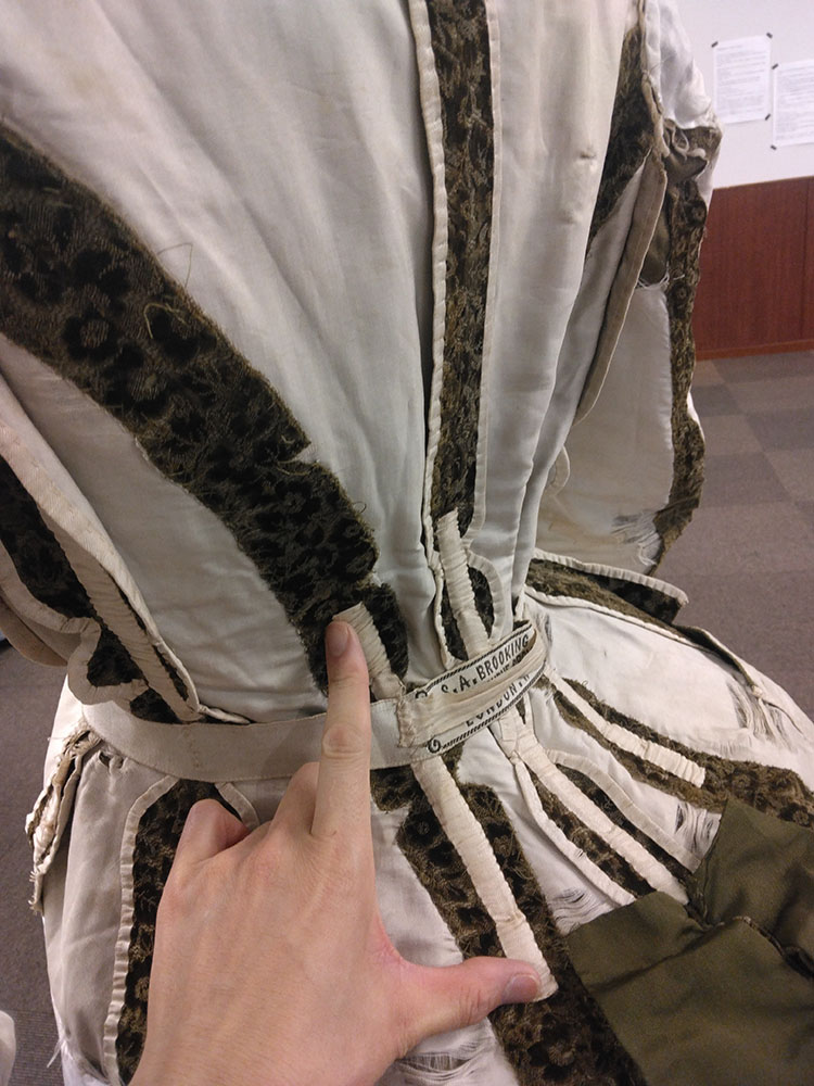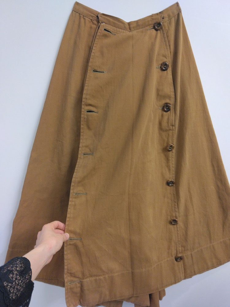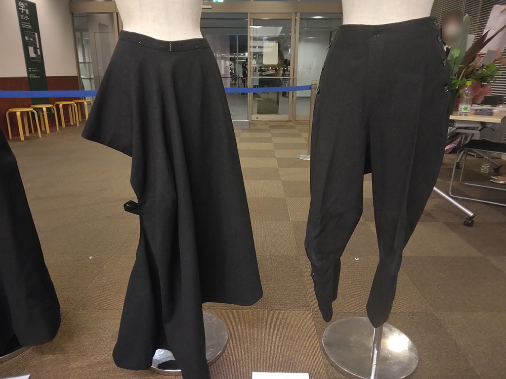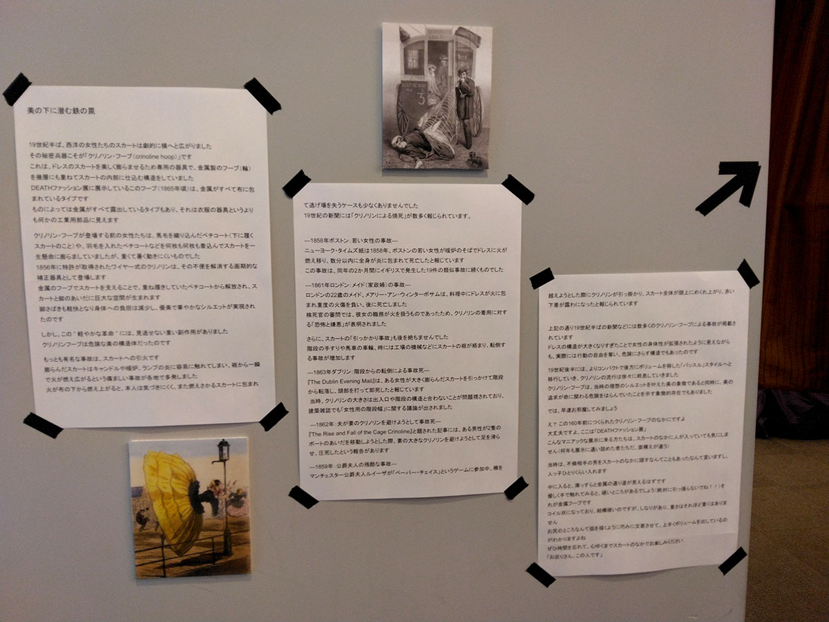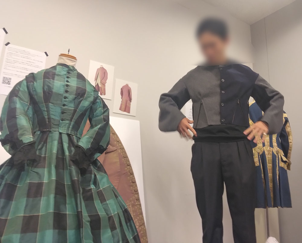 去年はヴィクトリア朝のドレスで、時代ごとの流行を一気に見られましたが 今年はDEATHファッション展ということで、危険性のあるデザインや素材のドレスから、当時の安全性を振り返る展示でこれまた超超勉強になりました (本当は去年あった下着の方も行きたかった!) 以下折りたたんでレポです。というか、自分用メモ 去年の展示のレポはこちら ※映っている人物の顔は、長谷川さん含めすべてぼかしてあります 今回のメイン サイドサドル用のドレス 女性の乗馬の、横乗りの時のドレスだそうです 19世紀末に、女性の安全性を考えて進化していったとのこと 女性が馬に跨るなんてNG、足首も絶対見せたらいけない いかに優雅な姿勢で綺麗なスカートのラインを見せるか いやカタリナちゃんがですね、馬に跨って乗る時どんな服を着たらいいのかなって そこの興味から行ったんですけど ちょっと想像斜め上まっすぐ進んでて目から鱗でした まず跨いで乗るなと、そこからだった成程! そのドレスの形がもはや謎過ぎる 何だろうこの謎のパターン スカートの内側に右膝を入れる空間があり、ストッパーまでついている つま先をストッパーに引っかけて優雅に乗りこなすようです スッゲー 完全に膝のポーズが決まっているデザイン 生地も分厚いウールのような素材で、形が一切崩れない ヒラヒラなんてご法度、セレニティ御法度!そらそうだヒラヒラしたら危ないもんな 自転車にスカートで乗ったら危ないよなワカルー! でもこの形は馬に乗っている時だけしか必要ない 降りたらもうじゃまでしかない膝部分の余白よ それを、このスカートリフターで留めるのがカッコイイ ちなみにこちらのドレスはスカートの後ろにもともとボタンが着いていて、そこに裾のフープを引っかけて持ち上げ、歩きやすくしたりするようです 他にも隠れた部分に機能性を考えた工夫が 馬に乗っている内に動けばスカートは回ってしまう それを固定するのに、スカート後ろのウエストにボタンがあり ジャケットの内側の引っかける部分とドッキングさせたりするとのこと 確か去年も飾ってあったこのサイドサドルのドレス 詳しいことがわからずスルーするしかなかったので、今回ゆっくり解説が聞けてとても良かったです どんどん進化していくサイドサドルのドレス こちらはエプロンモデルというらしく、ズボンとセットで腰に巻くタイプのスカート 馬に乗っている間は後ろの布いらなくない? ていうわけで反対側を切ってエプロンのように腰に巻く これでとても軽くなる 安全性高まる! スナップボタンも活用していて(この時代特許を取ってあるスナップボタン) 事故が起きた時も簡単に取れる仕様だそうです 18604年にサイドサドルは危ないからやめようよと記した女性の日記。 そこから40年後くらいにようやく、女性も跨って乗ろうという流れで跨るスカートが生まれる こちらがそのスカート クロスサドルスカートです ボタンを留める位置で、ズボンにもなるしスカートにもなる 何だこれすごい今でも使えるオシャレデザイン 今日はズボン、明日はスカート、気分で変えられるね! ズボン側を紺色でウラヌス、裏返してスカートにしたらネプチューン 一人でウラネプごっこ、気分はカリスマ え、作りたい誰か着ませんかね こちら去年も展示してあった、ヒ素で染色した死のドレス クリノリン時代のドレスで、長谷川さんが手に入れた時はリメイクしてあったけれど 一度解体して復元したとのこと 最高に狂ってるねとても素敵 ハラショー 1860年頃のドレス(1850年にはミシン導入してる) スカートもほぼ切らず、四角のまま上だけダーツ 巾62cm×スカート10枚 リメイクが主流だった時代、ダーツもほぼ布を切らない布が生きている時代のドレス (ダーツを切り刻むと布の死と仰っていたのが厨二病で最高オブ最高でした) 面白かったのが上身頃の解説 チェックの四角い柄の位置が左右でズレている 左右で布の天地をひっくり返している部分がある これを分かりやすく色分けして、黒は引っくり返った部分だと解説している場面です 布を極力節約する心意気よ そしてデザインとしても素敵 こちらも今回大きな見どころのうちの一つ クリノリン時代のドレスを下から覗くことができる こんなの初めてよスッゲー! フープが複雑に仕込んであります 形状記憶ビクともしない 展示の仕方がとにかく異質 半分くらい裏返してトルソーに着せているんですけど どういうこと (去年ちゃんと表の時に一度見ておいて良かったと思う現場よ) こことか特に痺れた 腰部分に徹底したボーン 絶対ここは細く固定してやるぞ覚悟しろよがひしひし伝わってくるボーン(ウエスト寸法標準46cmの世界) あとこれも興味深かった 遺髪で作ったアクセサリー 当時は死を身近で感じていた時代というのがよくわかる アッこんなところにボタン発見! 堂々と真ん中から割って着脱ですね しかもボタンもしっかり優雅 こちらも大変興味深く 長谷川さんに直接お話を伺った案件 これ