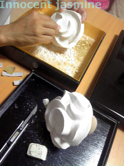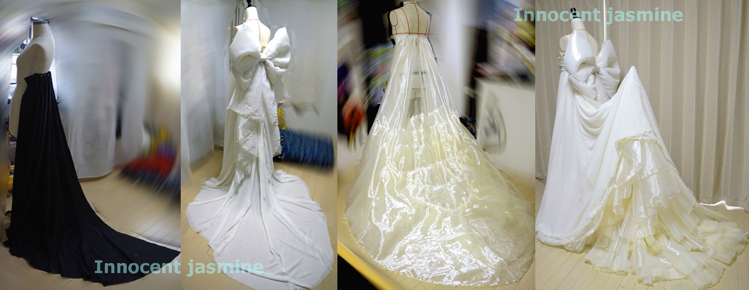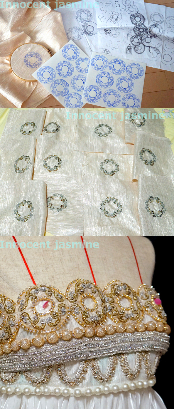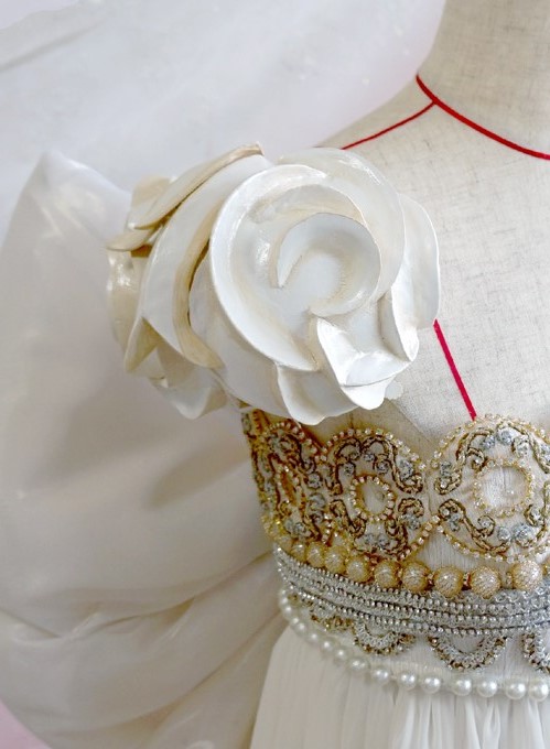 去年は自分的にセレニティ年で、ものすごい勢いでドレスを作っていた気がします 恐ろしい話をすると、初めてオカダヤの会員ランクが上限に達しました ひいおそろしい……でもドレスってお金、面白いくらいなくなりますよね ウフフ 特にこのドレスはとてつもない執念を込めて作ったので、とても思い入れのある一着となりました 執念込めすぎてもはや怨念が宿ってます、きっと お先にtwitterではいつも速報を載せているのですが、ありがたいことにたくさんの方に 見て頂けて、ありったけの手間と愛を掛けて作ったのでとても嬉しかったです。 ねとらぼさんに取材のお話もいただきまして、光栄でしたので受けさせていただきました ねとらぼ ネオ・クイーン・セレニティのドレスを麗しく完全再現 透き通るような透明感がすごい そしてようやっと自分のブロクでもアップします 毎度マイペースにのんびりやってます 全身 全体的にアンティークな色味で仕上げようと、アイボリーの生地を使用しました スカートに使用したパウダーシフォンがとてもとても優秀で、 手触りがしっとりとしてドレープが綺麗に出るのですが 人気があるのにメーカーがすぐに生産をしなくなり、今や廃盤となってしまった とても残念なそんな裏話 これを触るともう他のシフォンは使えない……今後どうしたらいいのかと 悩まされていたのですが、一応新作の似たようなシフォンは出たようです それも良い肌触りですがやはりパウダーシフォンが一番だった 本当に無念…… 後ろのリボンは金の箔をうっすらと塗布した綺麗な生地を仕様 これまたとても上品な色味です 写真ではほとんどお伝えできないのですが 生で見るととても良い 上部分 今回は輪っか部分を刺繍で表現してみました 後にご説明しますが、これが中々の鬼畜仕様 おかげでネオクインの優雅さが表現できたと思います パールも金網がコーティングされたおもしろいものを見つけたので使いました 見つけたといってもこれまた大変な裏話がが しまむらのネックレスの一部のパーツでして、ひとつの完成品に8個しか 付いていないので、近場のしまむらから遠くまで探し回りかき集めた貴重品です 同じものは二度と作れない、今回のドレスはいろんな部分にそんな要素が詰まっています かたつむり部分の造形は家族と共に知恵を集めて仕上げました 細かい監修とデザインを私がやって、実際削るのは旦那さん 素材は石膏を使用しています 最近はパテで造形は作っているのですが 初期は石膏から始めた我らです このかたつむりに関しては石膏で良かったなと思います アンティークなイメージにはパテより石膏の方が合う気がする これも後ほど詳細書きますが、スカートの後ろ半分はボリュームをアップさせる為 内側にペチコートを組み込んでいます これをやらないとぺったんこでシルエットが出ません 後ろ半分だけというのにも自分なりのこだわりを込めています つづきから制作過程と詳しい説明を語りまっす お先に次回の記事予告 ~そのに ネオ・クイーン・セレニティへの道 装飾編~ 30世紀へと続く果てしない道のり その第二弾です ・スカート部分の型紙制作から仕上げまで 先ず型紙を作って裁断、表のスカートは生地を20m使用しています それだけでは膨らみが足りないので後ろ半分だけのペチコートも制作 後ろ半分というのがポイント 原作版のセレニティは透明感のあるイメージで、イラストによっては足が透けているように描かれている時があり スカートのボリュームも欲しいけど足元も透けたい! そんな二つを叶えるべく後ろだけ膨らみを出そうと試みました シフォンの薄さが際立つ透け感 このドレープ感に手触りのしっとり感まであるのはパウダーシフォンだけ 廃盤はほんと辛い事実 後ろ半分だけのペチコートでも20m分生地を使っているので スカート部分だけで合計40m程の計算 半端ない布量なので運ぶ際はかさばって大変 胸部分は多種類のブレードを重ねて模様を浮かばせる 白銀と金色を程良く重ねて自分好みの色味を出してます ど鬼畜の刺繍 図案を何度も何度も試行錯誤して書き直し決定 こっそりデマンドの胸のにょろにょろのイメージをデザインに組み込んでいるのが 個人的裏萌えポイント 自分だけが分かるネオデマ たまらん 図案を完成させたらダイソーの刺繍シートでなぞり、ひたすら縫うべし縫うべし これが一体どのくらいの時間が掛かるのか、戦々恐々としたのだけれど ここが一番のキチガイポイントだった わずか三日で仕上げてしまい、ちょっと自分で自分がよく分からなかった 時を超えた気がする 嘘だろ 5種類の糸を使用して色味を調整し、立体感が出るようにしています かたつむりの制作風景 私が描いたデザインをひたすら削る旦那さん 監修が鬼です ありがとう旦那さん 白塗装の上にアイボリーで影を付ける 影塗装は私が頑張りましたよ! 執念と情熱とお金を一心に注ぎ込んだ一着 写真では詳細が伝わらないので実物をどこかに
