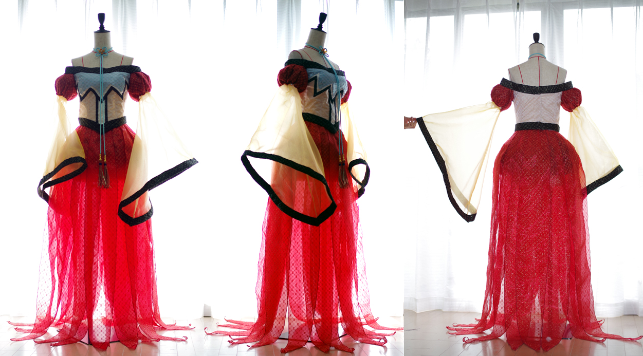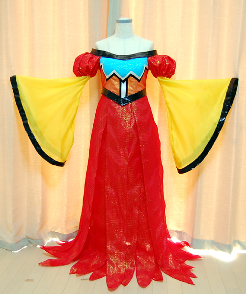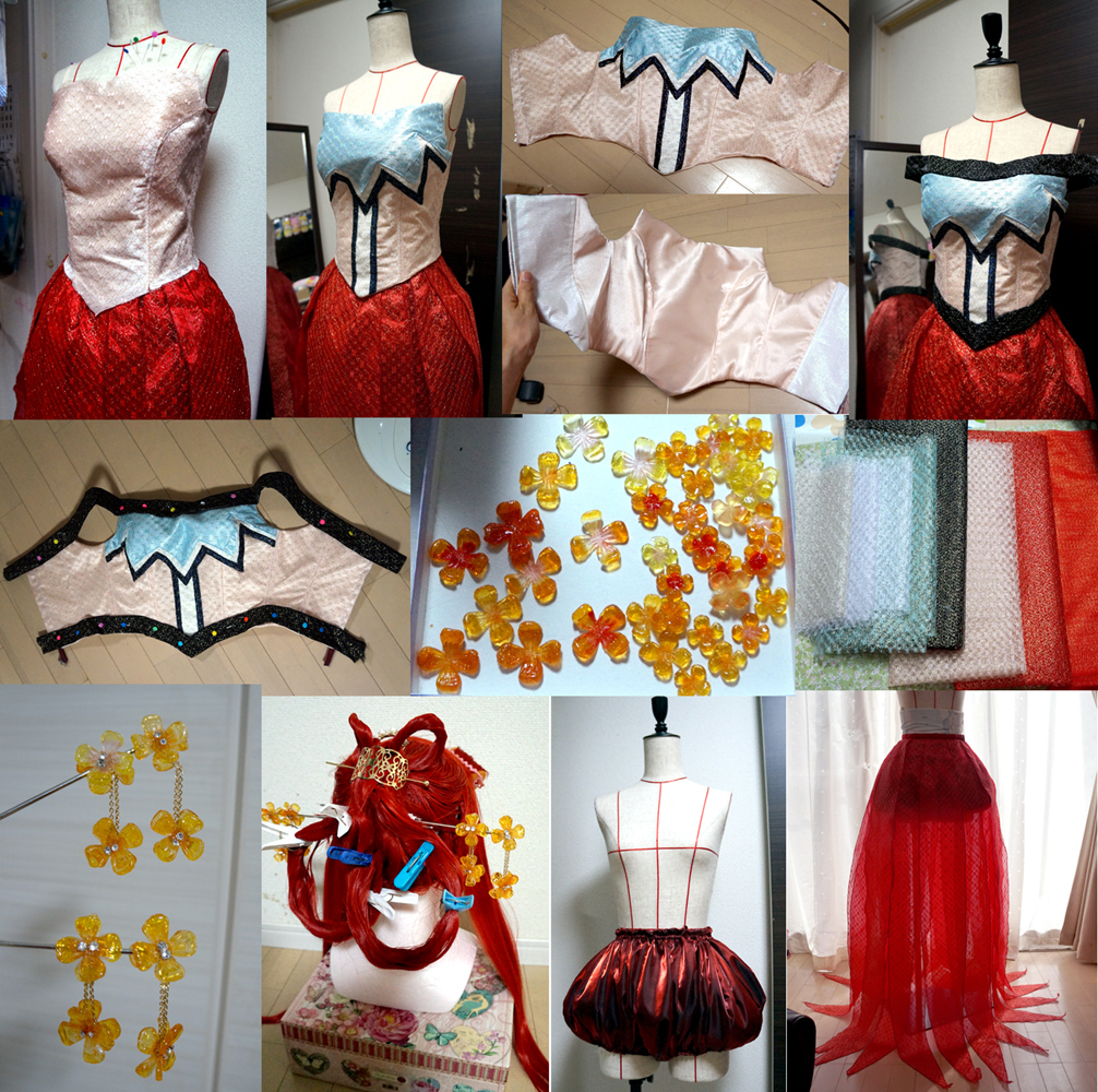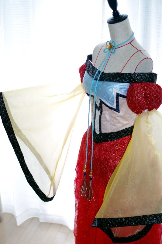 色々レポが追いついてない 火球皇女原作版 アニメ版より色が淡いイメージです 帽子の装飾もアニメより多め 赤いスカートから透けるかぼちゃのぱんつがトレードマーク かぼちゃぱんつに140幅の生地を2m使っているとは思うまい 火球様の優雅さを表現するために、生地表面全てラインも含めて蝶柄の金糸のソフトチュールでコーティングしました ワイヤー入りパットにボーンもばっちり仕込んだので体のラインはしっかり出ます アニメ版との比較 身体部分のオレンジと袖の黄色みが原作はもう少し淡め 頭の先からつま先まで、手の込んだお姫様 タッセルはほんの少しだけアレンジをしてあります ウィッグはお友達に作っていただきました 制作風景 かんざしのキンモクの花びらを、我が家の造形担当にレジンで散々作ってもらいました 黄色味増やしたりオレンジを濃くしたり、色味を少しずつ変えて組み合わせてグラデを出しています 細部に手縫い部分も多くてとてもとても苦労したけどやり甲斐のある一品でした 次回予告 火球様コスレポ総集編 |
