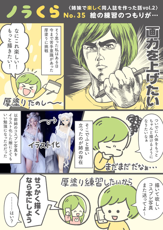 制作秘話のエッセイ漫画を書いてくれました 面白かったからブログでも公開 ※ここに載っている廊下に飾ってあったサターンの等身大ポスターですが 世になかったので当時の私が必死に描いたものです ビデオパッケージ伊藤郁子さんのサターンに射抜かれて どうしても大きくして飾りたい!と情熱のままに仕上げました 何かを提案されると二言目には「本にしよう」という姉 斎場に飾ります、一緒に燃えて成仏したいです 妹の手の平で転がされる姉をリアルにやってきました ※裏話 「全部同じ顔で並ぶと怖いね」と家の者に言われ いや二次元漫画は作者一人だったら元々全部同じ顔であり それは作風というのだよ だから本当は三次元でも全員同じ人が表現しないと再現とは言えないと力説 仕上がったコスプレ漫画を見て 全員同じ顔で何てシュールなのだとしみじみ思いました(力説ぶち壊し コスプレ20年のご褒美 毎日眺めてニヤニヤしてます 自分も楽しみ人も楽しませたいというのがすごい 姉はひたすら自分が楽しいだけで生きてます イラストゲスト本に関わってくださった全ての方々、ありがとうございました! 次回 イラストゲスト本外伝 |