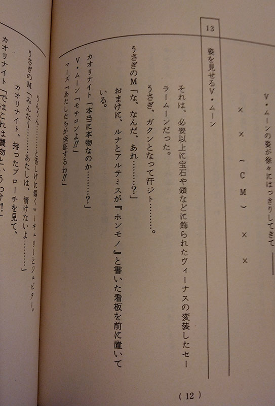 そんな一着のご紹介です このセーラームーンが月に代わっておしおきよ! 何か絶妙にチガウ!!そんなマニアなら瞬時に大笑いする セーラームーンに変装したV・ムーン(美奈子ムーン)です ネルケのネタでもありましたね(その時はちびうさがヴィーナスの代わりをしていた) こんな一発ネタなのに、やろうと思ったら必要なのが まるっと一体戦士服(後ろリボンもヴィーナスの黄色と併用できない)、ブローチ、ブーツカバー 絶妙に色味を変えているせいで何気にフルセット!全力投球の制作ですよ これにめんどくさいデザインのウィッグまで作らないとなので 中々にハードルの高い一発芸となっております しかも小道具がこれですよ 背景ののぼり 作っている最中から笑いが止まらんかったです! しかもこれも地味に手間がかかっていて 木枠の接合部分は我が家の造形担当がわざわざ組み木の仕様にして 上手に合わさるように作ってくれました 感謝! ブーツカバーも見てください 長年作り続けて地味にラインの精度を上げてきた成果を大発揮しました こんな一発芸で……次はいつ使うか分からないのに! じゃん! ムーン(本物)と並べるともう永遠に笑っていられる しかもムーンの青色の方がしっかりした色味で V・ムーンは比べると少しくすんでいるので絶妙に偽物感が出ているんですね ムーンで使用した青のカシドスがメーカー廃盤でもう使えなかっただけなのですが 今回に至ってはよい仕事をしたなあという感じです 正直ムーンの青生地はこの廃盤になったカシドスが色味も質感もダントツだったので 今後ムーンを作る時にどれを使ったらいいのかと頭を悩ませております 単体なら気付かないけど並べてわかるこの格差よ どうしたらいいんだ 二コマでコント 衣装だけでも伝わってくる両者の温度差よ 最高だな 今回の102話ですが、AKIKOさんが初期脚本をお持ちだったので 確認させていただきました(感謝) 隅沢さんの書かれた脚本ですね。佐々木憲世さんの演出が着く前でございます ここには何とヴィーナスに変装ペンを渡すシーンがあったりします 本編だとここはちょっと濁した風に変更されていますね V・ムーンの登場をよりセンセーショナルな見せ方にしたかったのだなと推測 (本編ではその後「折角ルナから変装ペンを借りたいのに~!」と補足が追加されていた) こういうちよっとしたセリフ回しの変更で場の印象が変わるから演出ってすごい そしてこれが驚愕の事実でした V・ムーンの登場シーンの説明 「それは、必要以上に宝石や鎖などに飾られたヴィーナスの変装したセーラームーンだった」 ちょっとまって情報が多すぎて困惑する!! 隅沢さんのイメージしていた変装ってどんなだったのマジか しかも『姿を見せるV・ムーン』という表記で、このキャラがV・ムーンという名前なのだと知りました これはすごい! なるほどヴィーナスのVなのかな Vちゃんも匂わせてて絶妙ですね 今までは美奈子ムーンと呼んでいたのですが 今この時点からV・ムーンに変更させていただきます 毎度初期脚本は勉強になってありがたい限り 永遠に分析していられる すげえ 毎週更新しているこのブログですが 来週はちょっとよく分からないくらいの制作修羅場なので一週間お休みします コスナビ展に向けて制作と撮影が佳境です エタムンの羽頑張って作る 映画もついに始まります 盛り上がっていくぞー!