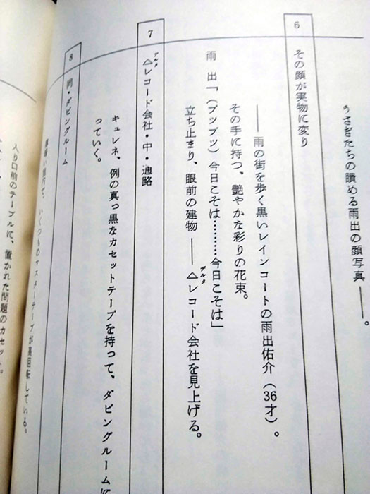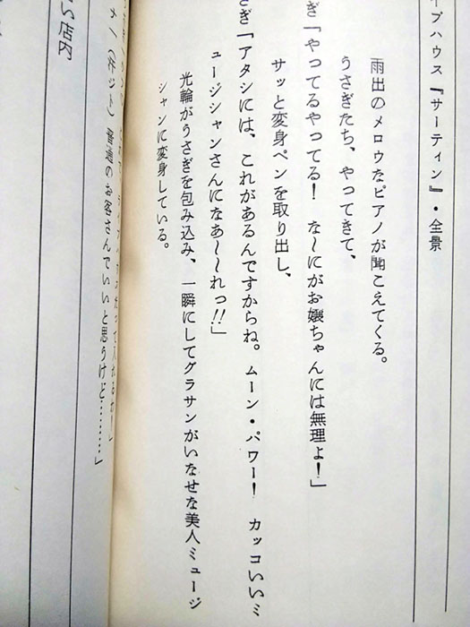 今週はひょんなことからネット記事の取材を受けさせていただきまして そちらの関連で台本分析をやりたくなったので挟みます 無印の中で個人的にお気に入りの私服が登場する6話です 6話仮題「正義の味方はおじさんが好き」 本編「守れ恋の曲! うさぎはキューピッド」 脚本 隅沢克之 演出 幾原邦彦 作画監督 只野和子 またも幾原ワールド大全開な一話 幾原さん自身にとっても思い出深い一話のようです(ツイッターより 取材いただいた記事はこちら 28年前、セーラームーンに出会って私の人生は決まった。夢みたいなクローゼットが最高すぎる! 折り込んで解説いきます 今回は私服話から派生していくので 私服の解説からまずはご覧下さい 第6話は大人の恋にうさぎちゃんが首を突っ込むストーリーなのですが 全体的にシックな雰囲気で、子供心にとても印象的な回でした うさぎちゃんが変装ペンで変身する時に 「かっこいい大人のミュージシャンになーれ!」と わざわざ"大人の"を付け加えている所も 背伸びをしている等身大の女の子が見事に表現されていて とても共感できました このお話で大事な演出に使われているのは「雨」 シトシトと降る雨が、街の雰囲気を物寂しげにしている所が重要ポイントです 実はこの私服は今日がおろしたて 転んで濡らした矢先、おニューの服なのに!と 本編で彼女が嘆いているのですが、お出かけが憂鬱になりそうな雨の日に わざわざ新しい服を選ぶ所からも 少しでも気分を上げる為にオシャレをした うさぎちゃんの乙女心が見えるようでトキメキます そこに加え、私服のカラーに合わせた傘までさしているんです 正に雨の日のお出かけ用として完成された私服といっても過言ではありません この一着は雨の日のストーリーを最大限に生かす演出をされた幾原邦彦さんと 作画監督只野和子さんの私服デザインが融合して作り上げられた奇跡の私服だと思います 質問に回答した一部分を抜粋 個人的解釈をざっと並べました おう、長いな こんなに長くて重い愛を綺麗に整理して記事にしてくださったライターさんには感謝しかない ツイッターは文字数140文字なので普段は要点の中でも厳選した ごく一部のポイントしか伝えることができないんですが 本当は一着でこれくらい語りたい、そんなワタシ いやあツイッターのうさこさんって無口よね てへぺろ! この回答を答えるに当たり 脚本から演出がどう加わっていったのかを確認するべく台本を開いた次第です 軽く追加で感想をば ストーリーの全体図は脚本の時点で完成されていて 幾原さんはそこにうさぎのあどけなさを足す演出を施した感じ うさぎの幼さが強調されると、しっとりした大人の世界観が程よく崩されて ギュッと締まるんですよ いやすごいよ幾原マジック いや実はちょっとドキハラしたよね R時代の幾原さんは脚本から大改変する事が多々あったから (R劇場版とかルベウスのキャラ作りとか) 今回もよもや雨の演出ご本人で加えたのかとすら思ったけど 脚本の隅沢さんがとてもしっとりした素敵な雨の日のお話を書いてくださっていた 幾原さんが暴走せず、程よくアレンジしていて新鮮でした(言い方よ ああだけどひとつ、ここひとつだけ突っ込ませて…… 雨出ゆうすけ(36才) 待って、おじさんって言わないであげて……とつい突っ込みたくなる年齢 でも程よくくたびれた感じのビジュアルが36には見えなかった当時 45歳くらいに見えたよね ちゃんと中学生から見ておじさんに見える人物にしてくださった只野さん 上でも語ったけどここがとても大事 「服がびっしょり」を「おニューの服なのに」とさり気なく付け加えた神演出 おニューの服が汚れてテンションはダダ下がり 返して言えば、気合を入れた服だったから余計にショックというこの乙女心のエッセンス うさぎちゃんの可愛らしさが引き立つ魔法の一言です そうきっと幾原さんは魔法使い そしてそんな雰囲気を読んだ私服をデザインした只野さんも魔法使い 雨の日をストーリーにした隅沢さんも魔法使い この私服、普段ラフで着ている服よりも少し よそ行きみたいなイメージで自分の中で固まっているんだけど こういうさりげない一言から印象が固まっていくのだなと 大人になった今分析してはニヤニヤする楽しい遊び こちらもとても大事な一言 「かっこいいミュージシャン」を「かっこいい大人のミュージシャン」に追加変更 これによりうさぎちゃんの背伸び感が倍増し 大人のお店に潜入する雰囲気が上がる 神や、神 話は変わるけど、当時この話で自分は「サブリミナル効果」 という単語を覚えました 子供心にすごく耳に新しい言葉で、すげえ強く印象に残ったんだよなあ 足りない解説を付け足してやっと満足したのでそろそろ終わる ではではまた来週 |