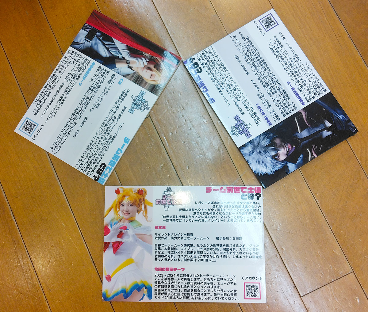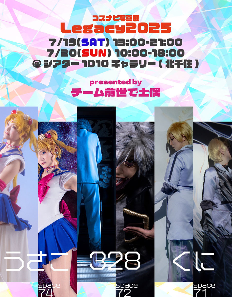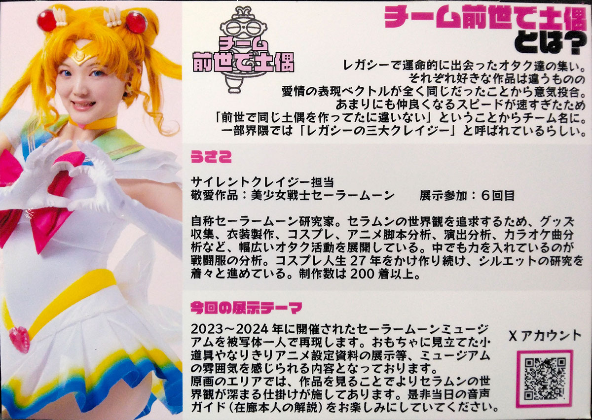 7/19.20のコスナビ展でようやく一息つきました 本当に、もう、年明けから一切気を抜かずに突っ走ってきました そして何とか、やりたいこと全て上手く収められた気がします オメデトー! 具体的に何をしていたかと言いますと 1月は大阪インテのイベントから始まり(フラブレアンソロ発行) ウィッチーズ5の写真集のメンバーとして制作に関わらせていただき ジオカタ蛇写真集の撮影&ウラヌス写真集の撮影と写真集二冊分の構成を考えつつ ちくちくに関しては今年蛇年ということで蛇の玩具を100匹作ることを目標としていたので 年明けから狂ったように蛇を作り続け その間に透明ムーンスティックの制作も手掛け 3月には春コミに参加し スーパーセーラームーン(原作版)のグラデーション戦士服を全力で仕上げ 5月はスパコミにも二日間(セラムンとはめふら両日)参加して その際ウラヌス写真集を発行(ウィッチーズ写真集も同日に発行) そこからコスナビ展準備の怒涛の日々が追加され 制作から撮影、パネル製作、無配冊子の制作 その合間にジオカタ蛇写真集の制作もしつつ 6月末には大阪のセラムンオンリームーンミラクルに参加 実はこの間ずっと、ジオカタハッピーエンドアンソロジーの打ち合わせと原稿とページ構成があったんですよこれがもう一番のプレッシャーでございましたね実のところ そうしていよいよ7月に入り、上半期進めていた準備が大放出です 13日には赤ブー主催の「星に願いを2」内ジオカタオンリー『野菜畑で恋路を語る』にて ジオカタハッピーアンソロジーがめでたく発行されました おめでとうありがとう そうして遂に19日 一年で自分にとって一番熱い展示会、レガシー2025が開催されました 激戦の上半期を何とか乗り越え、7月に行き着いて、全力でほっとしました頑張った!(そして一週間腑抜けになりブログの更新も止まり音信不通になる) そんな上半期(ちょっと下半期含む)を7月のうちにブログに綴り 8月からは心機一転、コミケの原稿に取り掛かりたく存じます 今回コミケの開催が一週間遅れ、インテがぶつかっていることもあり 土曜コミケからの日曜大阪インテと、怒涛のスケジュールが組まれております 下半期はまずはここを乗り切るのが大事 その後は内部五戦士の制作をしながらセレニティを一着作り スパークにはジオカタ結婚本の続巻を発行、冬コミ受かればネプチューン写真集の発行 ここまで、ここまでが年内のミッションであります 今出来る事、今しか出来ない事を、何としてもやり切りたい やり甲斐と達成感の為に楽しく頑張ろう エイオー! 前置きが長くなりましたが 今回はコスナビ展のレポでございます 続けて明日には、7月までの思い出を振り返るレポを更新する予定です 自分の中のスイッチを切り替える為に頑張って書いて私 チーム前世で土偶 うさこ 328さん くにさん 折り込んでレポへと続きます 今回は何と、初めてのグループ展示です グループ展示はカメラマンさんたちがされているのは見かけていたので レイヤーさんもやってみたい!というのもあり 今回うさこ、328さん、くにさんで『チーム前世で土偶』を結成しました はてさて、前世で土偶とは―― このやうないきさつがございまして 今回サイレントクレイジーを担当させていただきましたありがとうございます! (去年のくにさんと328さんのレガシーお疲れさまスペースに当方が乱入し とんとん拍子に話が進んだというのが真相です) 当日の光景 すげえ統一感ゼロだ!! いや違う、志は同じ方向を向いているんだわかるだろわからんか オープンクレイジー担当:328さん ヒロアカクレイジーな328さんの今回の展示の目玉は何と言っても仏壇 写真展なのに目玉が仏壇なんだぜクレイジーだろ?! でもこれだけじゃないんだ見て欲しいものは 328さんのフリー名刺 こちら線香で燻してあり、線香の香り付きなんですよ 仏壇4Dを目指しつつ、でもリアル線香は現場では使えないという事で 線香の香りだけ持ってきたこの発想よ 何と…今(半月経過)でもバリバリ線香臭漂ってます 煙のパワーは凄い、硝煙反応が出る訳である 仏壇の迫力に呑まれつつ、実はここもすごい 展示が両日総入れ替え アニメ一期までしかまだ到達していない私には話の筋は分からなくても 二日目の方が狂気が増しているのは伝わってくる そして突然のお客さん参加型 inoriさんが黒い洋服で、ご霊前を差し入れていて現場がどよめきました(笑) でもって、、私のツボを一番突いたのはココ! 解説用のコミックスを仏壇の裏に隠している風景がまるで 中学生男子が自宅の仏壇の裏にエロ本を隠しているようで震えて笑う 超失礼だと思いつつも突っ込ませていただきましたァァ 仏壇の裏にエロ本 隠すだろうかいや隠す 私はテレビの後ろに隠していました(突然のカミングアウト そしてシークレットクレイジー担当:くにさん アイナナクレイジーなくにさんは今回、不倫の曲をイメージした展示をして ……いやそれはご本人の解釈と言っていた気がするぞ、で