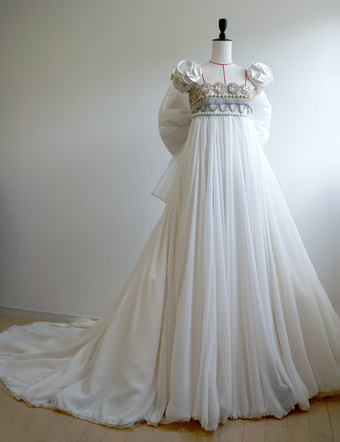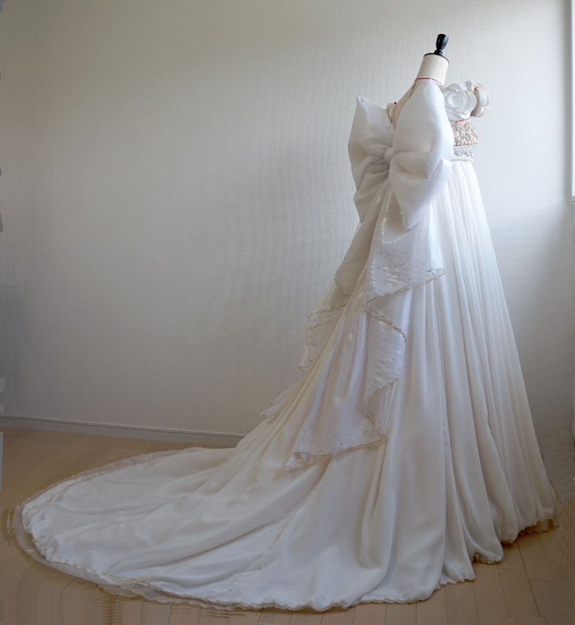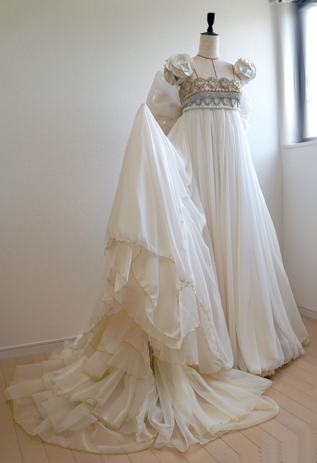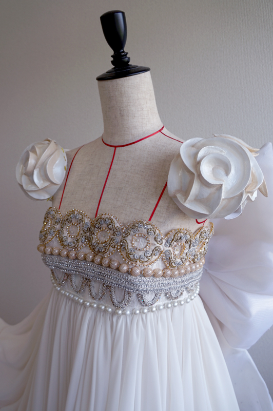 去年は自分的にセレニティ年で、ものすごい勢いでドレスを作っていた気がします 恐ろしい話をすると、初めてオカダヤの会員ランクが上限に達しました ひいおそろしい……でもドレスってお金、面白いくらいなくなりますよね ウフフ 特にこのドレスはとてつもない執念を込めて作ったので、とても思い入れのある一着となりました 執念込めすぎてもはや怨念が宿ってます、きっと お先にtwitterではいつも速報を載せているのですが、ありがたいことにたくさんの方に 見て頂けて、ありったけの手間と愛を掛けて作ったのでとても嬉しかったです。 ねとらぼさんに取材のお話もいただきまして、光栄でしたので受けさせていただきました ねとらぼ ネオ・クイーン・セレニティのドレスを麗しく完全再現 透き通るような透明感がすごい そしてようやっと自分のブロクでもアップします 毎度マイペースにのんびりやってます 全身 全体的にアンティークな色味で仕上げようと、アイボリーの生地を使用しました スカートに使用したパウダーシフォンがとてもとても優秀で、 手触りがしっとりとしてドレープが綺麗に出るのですが 人気があるのにメーカーがすぐに生産をしなくなり、今や廃盤となってしまった とても残念なそんな裏話 これを触るともう他のシフォンは使えない……今後どうしたらいいのかと 悩まされていたのですが、一応新作の似たようなシフォンは出たようです それも良い肌触りですがやはりパウダーシフォンが一番だった 本当に無念…… 後ろのリボンは金の箔をうっすらと塗布した綺麗な生地を仕様 これまたとても上品な色味です 写真ではほとんどお伝えできないのですが 生で見るととても良い 上部分 今回は輪っか部分を刺繍で表現してみました 後にご説明しますが、これが中々の鬼畜仕様 おかげでネオクインの優雅さが表現できたと思います パールも金網がコーティングされたおもしろいものを見つけたので使いました 見つけたといってもこれまた大変な裏話がが しまむらのネックレスの一部のパーツでして、ひとつの完成品に8個しか 付いていないので、近場のしまむらから遠くまで探し回りかき集めた貴重品です 同じものは二度と作れない、今回のドレスはいろんな部分にそんな要素が詰まっています かたつむり部分の造形は家族と共に知恵を集めて仕上げました 細かい監修とデザインを私がやって、実際削るのは旦那さん 素材は石膏を使用しています 最近はパテで造形は作っているのですが 初期は石膏から始めた我らです このかたつむりに関しては石膏で良かったなと思います アンティークなイメージにはパテより石膏の方が合う気がする これも後ほど詳細書きますが、スカートの後ろ半分はボリュームをアップさせる為 内側にペチコートを組み込んでいます これをやらないとぺったんこでシルエットが出ません 後ろ半分だけというのにも自分なりのこだわりを込めています つづきから制作過程と詳しい説明を語りまっす お先に次回の記事予告 ~そのに ネオ・クイーン・セレニティへの道 装飾編~ 30世紀へと続く果てしない道のり その第二弾です ・スカート部分の型紙制作から仕上げまで 先ず型紙を作って裁断、表のスカートは生地を20m使用しています それだけでは膨らみが足りないので後ろ半分だけのペチコートも制作 後ろ半分というのがポイント 原作版のセレニティは透明感のあるイメージで、イラストによっては足が透けているように描かれている時があり スカートのボリュームも欲しいけど足元も透けたい! そんな二つを叶えるべく後ろだけ膨らみを出そうと試みました シフォンの薄さが際立つ透け感 このドレープ感に手触りのしっとり感まであるのはパウダーシフォンだけ 廃盤はほんと辛い事実 後ろ半分だけのペチコートでも20m分生地を使っているので スカート部分だけで合計40m程の計算 半端ない布量なので運ぶ際はかさばって大変 胸部分は多種類のブレードを重ねて模様を浮かばせる 白銀と金色を程良く重ねて自分好みの色味を出してます ど鬼畜の刺繍 図案を何度も何度も試行錯誤して書き直し決定 こっそりデマンドの胸のにょろにょろのイメージをデザインに組み込んでいるのが 個人的裏萌えポイント 自分だけが分かるネオデマ たまらん 図案を完成させたらダイソーの刺繍シートでなぞり、ひたすら縫うべし縫うべし これが一体どのくらいの時間が掛かるのか、戦々恐々としたのだけれど ここが一番のキチガイポイントだった わずか三日で仕上げてしまい、ちょっと自分で自分がよく分からなかった 時を超えた気がする 嘘だろ 5種類の糸を使用して色味を調整し、立体感が出るようにしています かたつむりの制作風景 私が描いたデザインをひたすら削る旦那さん 監修が鬼です ありがとう旦那さん 白塗装の上にアイボリーで影を付ける 影塗装は私が頑張りましたよ! 執念と情熱とお金を一心に注ぎ込んだ一着 写真では詳細が伝わらないので実物をどこかに