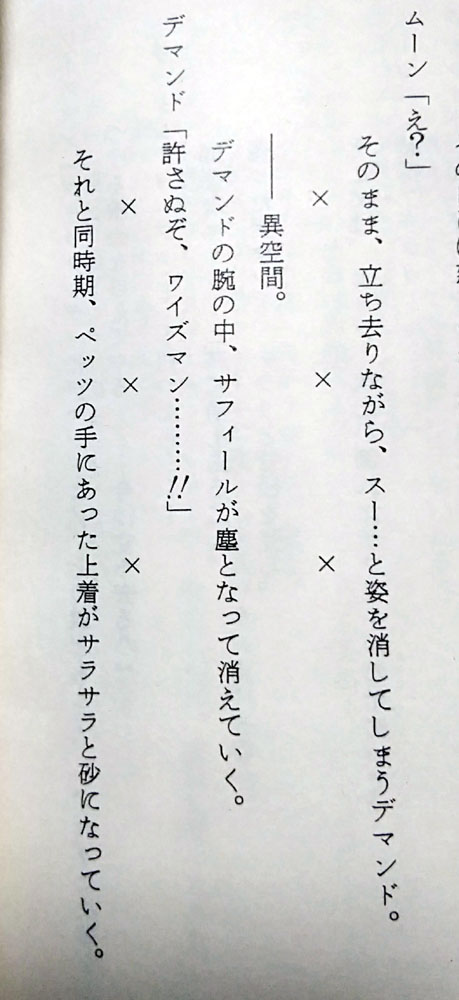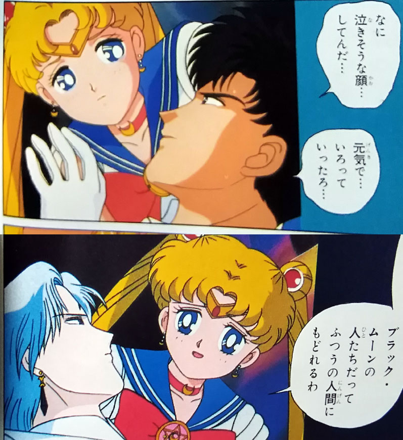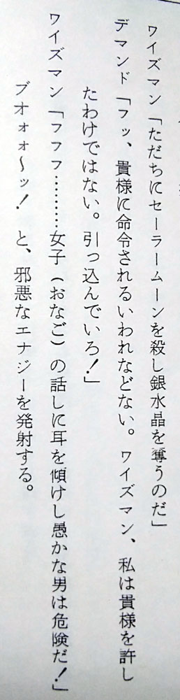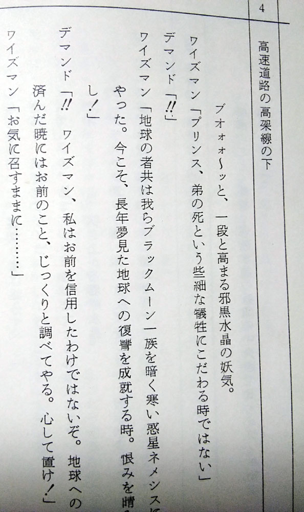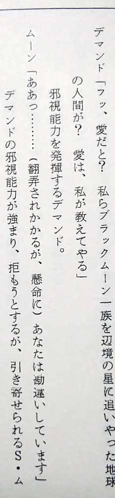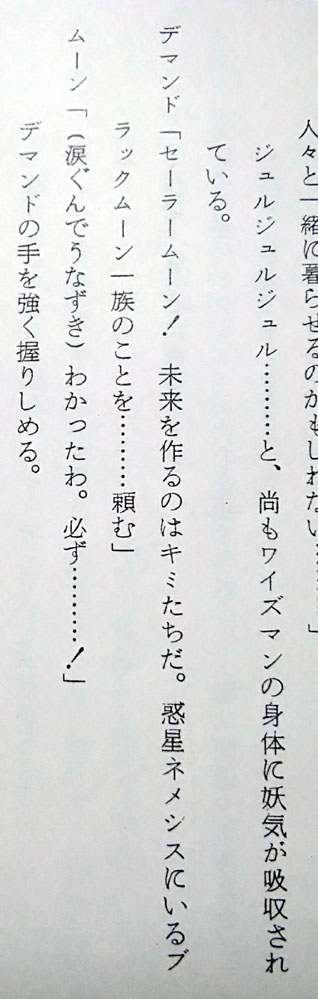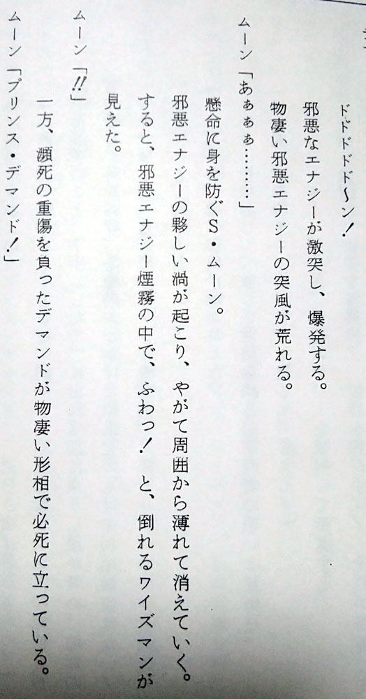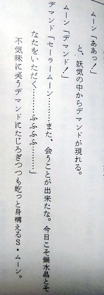 つまりは命日と言うことで毎年祭壇を飾ってはルマンド貪って偲んでいるのですが 今年は去年ゲットした台本の分析レポもしてみようかなと思います こんな機会でもないと勿体無くて台本が開けなかった人 満を持して開く(83話に同じ 87話 仮題「闇に輝く一条の愛」 本編「愛と未来を信じて!うさぎの決心」 脚本 富田祐弘 演出 小坂春女 作画監督 中村太一 まず仮題に惚れる、何だこの俺得タイトル!プリンス良かったね!! (実はうさぎちゃんのまもちゃん&ちびうさ愛の方を言ってるのかもしれないけど いや流石に今回の見せ場はプリンスだろ確定だろ良かったねプリンス!) 高速道路の高架線の下でワイズマンと長々話すプリンスのターン 何と、君達あれからネメシスに帰らずそこで話を続けていたんですかΣ えっと、前回の初期台本ではサフィールの亡骸を抱きしめたプリンスが 異空間に飛ぶシーンがあったんだけど あれですか、ネメシスに連れて帰る途中で弟が消えちゃって 怒りのあまり現場に即リターンしてワイズマンに抗議したってことですか 熱いプリンスだなおい! 先に帰宅して邪黒水晶の反応炉でワイズマンを待ち構えていた 本編プリンスより遥かに熱い男である 前回の初期脚本とどれだけリンクしているかは謎だけど (制作当時は同時進行だろうし、本編がどれだけ出来ていたかは分からんし) 状況を想像したら中々にシュール 時間経過がどのくらいかは謎ですが この感覚だとサフィール絶命回から直後に最終決戦に突入した感じでしょうか (本編だと翌日くらいの感覚でみていたけど) ちなみにこのデマンドとワイズマンの語りのシーン 台本だと中々に多くて読み応えあります よくしゃべるワイズマンか中二臭くてカッコイイ 惚れ直すゼ 話は戻りましてつづきです 少し状況は違うけど結局内部ちゃんとムーンは離れ離れになり ムーンだけプリンスと対面するシーンです 銀水晶とそなたをいただく…… はい二人称「そなた」キター! 台本分析83話(リンク参照)でも語りましたが 二人称がブレるのがプリンスの愛嬌 83話台本では「あなた」と「おまえ」が混在していたのに今回とうとうそなたが投入されました それもこれも脚本を書く人が毎回違うから………… いやまて83話も今回も脚本富田さんじゃないか一体どういうことですか富田さんっ ちなみに本編では83話は「おまえ」で統一 今回は「お前たち」「君たち」「そなた」が使用されました 脚本のそなたをそのまま採用して下さり個人的にとても嬉しい! ここからプリンスとムーンの長い会話が続く うさぎが珍しくですます調でプリンスに語りかけていて中々に珍しい光景です ネオクインを意識したのかどうなのか 今回は演出でタメ口に変更されたけど、次回88話は引き継がれているですます調 脚本では「愛は、私が教えてやる」 演出がついて「愛など奪い取ってやるさ」「愛とは力だ」 自分の力を過信した感じが引き立ってイイネイイネ そして忠誠の口づけをやたらと押してくる本編プリンスは演出家様の犯行 短い尺の中でようもここまで迫れるもんだ 素晴らしい 台本ではここの二人の対話、無駄に長くてニヤニヤします 無駄話は萌えの宝庫、無駄話万歳! ワイズマンに対しても前半「おまえ」と後半「きさま」 二人称がブレブレのプリンスよ (ちなみに今回は本編だと「きさま」で統一されてました) 脚本だと口調が全体的にとても高貴な王子様 ここから少し野性味を演出されて誕生する本編のプリンス 本編だと尺の都合なのか少し強い口調でとめられたりして どちらもかわいいですねかわいいですよ そしてここが一番の見せ場 ワイズマンの攻撃からムーン庇って倒れるプリンス しかし何と言うことでしょう 脚本だと二人が戦ってやられるだけの描写 ここで演出家の小坂春女さんが歴史に残る素晴らしい演出を投入してくださいました 参考文献 なかよしアニメブックス美少女戦士セーラームーン8 講談社 無印34話、セレニティ覚醒のまもうさシーン この回も小坂さんの演出です これは、中々の奇跡ではなかろうか…… 当時タキシード仮面様で見た同じ光景をフラッシュバックさせる演出を まさかプリンスでしてくださるとは 参考文献 アニメブックス 美少女戦士セーラームーンR9 講談社 過去のトラウマを引きずり出され抉られて もう一生ムーンの心に刻まれ忘れさせてくれない衝撃の死に様です 良かった、良かったねプリンス…… 未来を作るのはキミ達だ…… おう、ついに「キミ」まで言わせたな富田さん 83話から数えて「あなた」「おまえ」「そなた」「きみ」と どんだけムーンの呼び方変えたよ富田さん ありがとうそしてありがとう 一族の未来をプリンスから託されたムーン それを心に焼き付け遠い未来クイーンになる決心をこの時うさぎにさせたのだとしたら 彼の死はとても意味があったのだと納得させられる (本編タイトルの「うさぎの決心」はこのことだと思いたい) もう、ここのストーリー構成が本当に素晴らしくて痺れます 脚
