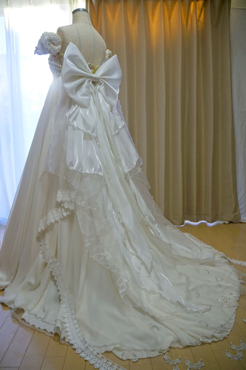 後ろリボンはつやつやのサテンオーガンジーを幾重にも重ね
