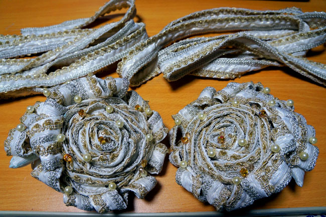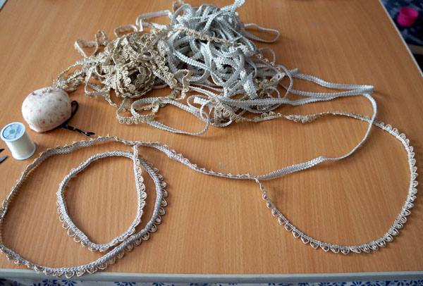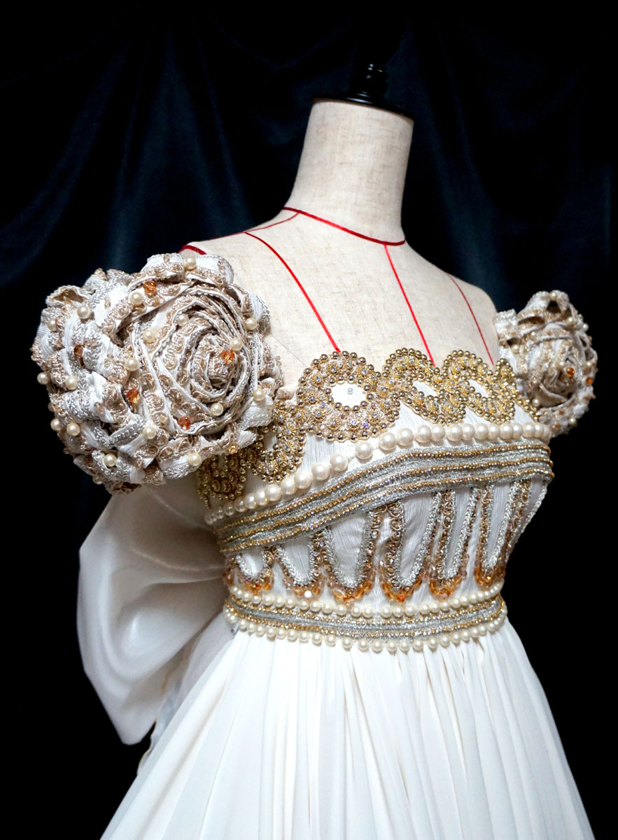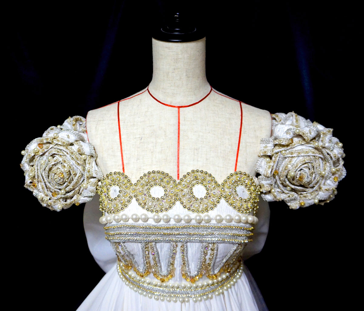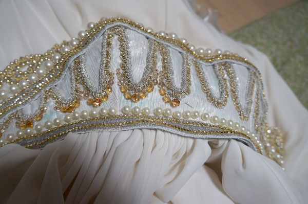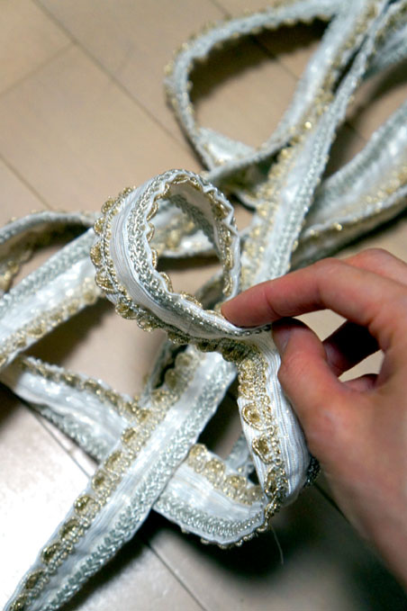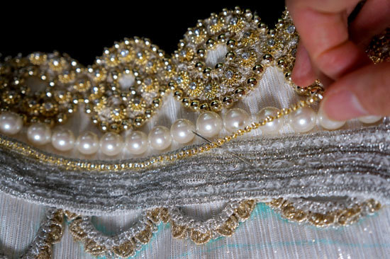 胸元の装飾部分、二種のブレードをひたすら重ねて縫い付けていく作業