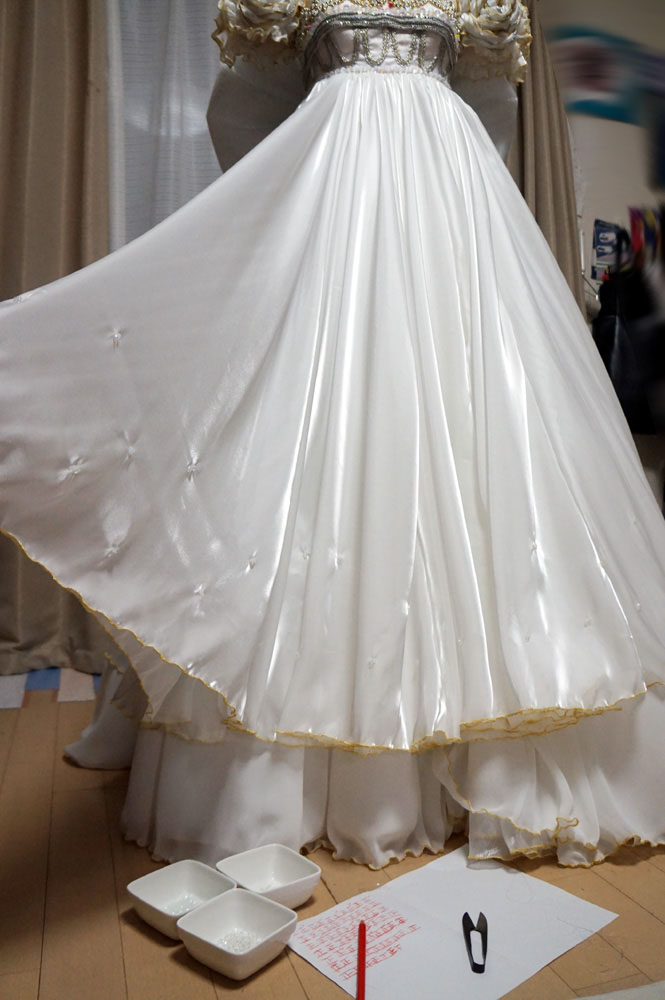 キラキラするかなと思いスカートにビーズをひたすら1500個縫い付けました