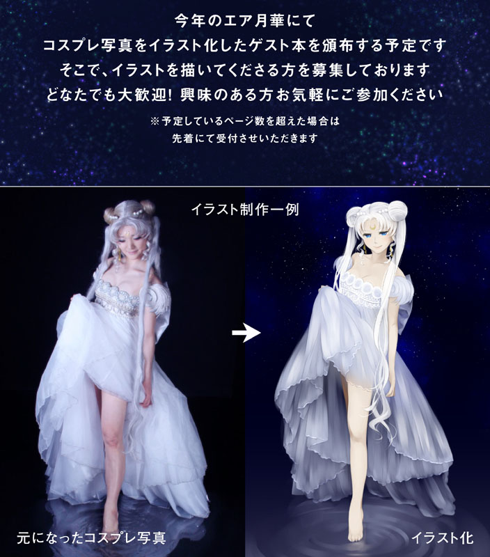 今年の10月エア月華にてコスプレ写真をイラスト化したゲスト本を発行する予定です ※ゲスト様の募集は締め切っております 参考イラスト:Nora デザイナーをしている妹のNoraが 「厚塗りの練習したいからコスプレ写真描かせて」 と言ってきたのが事の始まり 折角描くなら勿体ないからゲスト様呼んでゲスト本作ろうぜと提案し トントンと話が進んで今ここ そんな訳で初の姉妹合同誌!作らせていただきますうえーい 表紙と誌面のデザインはNoraが コスプレ写真はうさこ氏が ありがたいことにゲスト様はページ数に達したので締め切らせていただきました 他、面白い企画を二人で企んでいるのでどうぞお楽しみにでございます お好きなキャラを選んでいただく方式で募集したので 提供可能なキャラを一覧にしてみました 字面にしただけで中々のド迫力 よくこんなにやりましたねおねえさん 何せこの趣味22年くらいやってますからね 正直ここに載せてないキャラもまだまだあるし、忘れてる部分も絶対ある ごく一部過ぎる写真のサンプル 貯めに貯め続けてきた写真の数々、今ここに大解放 ネタ提供には事欠きません、好きなだけ選んで大丈夫よスタンス リアル同人誌イベントが中々開催されない中でも止まらずに本は作りたい 加速する情熱にこの肌が色を変える夏がやってくる 飛ばしていくぜごーごー