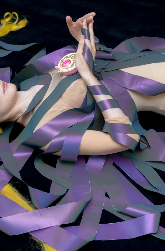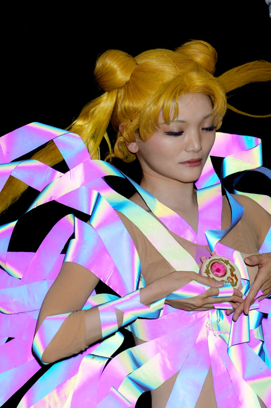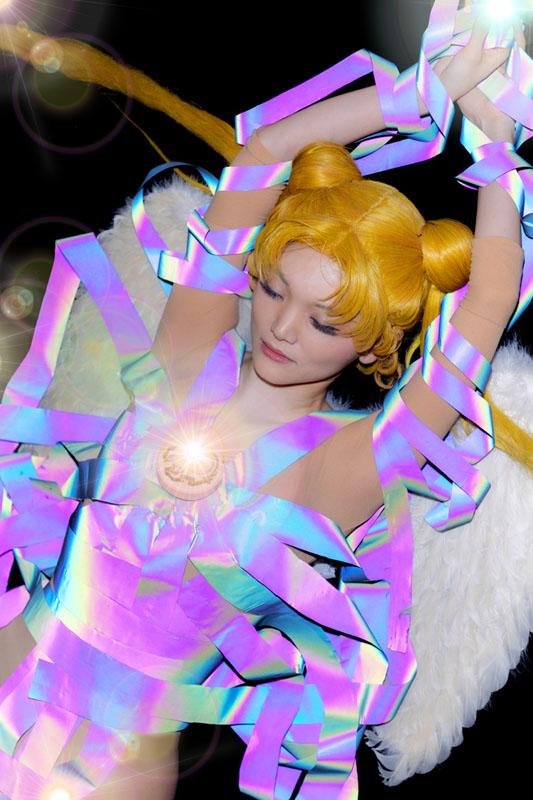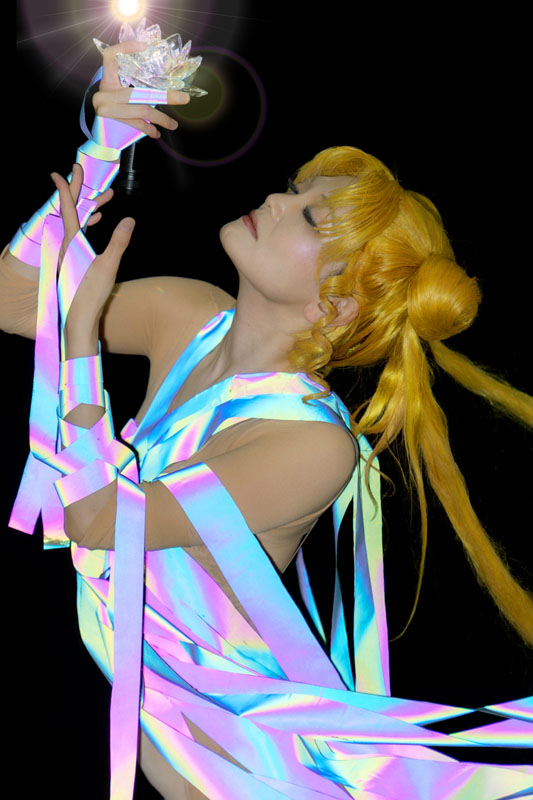 ムーンクリスタルパワーメイクアップ! いつも変身は全身にリボンを縫い付けたリボンレオタードで表現していましたが 今回面白い生地を見つけたので試してみたくて内部戦士撮影の最後にちょこっとお願いして 撮っていただきました Photo by 海老式さん 撮影補助 ○林さん ※肌色のボディタイツを着用しております オーロラリフレクターはオカダヤに置いてある話題の生地で フラッシュを当てるとオーロラに光るという言わば反射板のような機能を持った素材です なので光が当たらないとお話にならない(右写真撮影時の参考) 写真の中でだけオーロラを再現できるという、三次元世界の表現なのに 二次元に特化した性能を持っている面白い生地です。 これめっちゃ面白いじゃん!色々使ったらいいのに! と思うじゃないですか だがしかしそこまで万能な素材ではないのである。 光の当て方に制限があって、生地に対して光を直角に当てないと全然光らないのですね つまりどうなるかというと、被写体に堂々とド正面からストロボを当てることになるのです カメラマンの海老式さんが撮影中に 「カメラマンとして一番やってはいけないことをしていて今とても背徳感を感じる」 と言っていたのがめちゃくちゃツボでした(笑) しかも光の調整が難しいようで、肌色を活かせば生地がオーロラにならず(真っ白に写る) 生地を活かせば肌色が死ぬという どちらかを取らないといけないのがまた悩ましいポイントのよう。 だから普通に衣装の一部に使おうと思うと使い勝手が難しいかと思うのですが 変身中なら別に肌艶よくなくても良いので生地の素質を存分に活かせるのでは…… 正に変身シーンに特化した生地だなとしみじみ思った次第です R変身 羽も持参しましたよ! 生地を長い短冊状に切ったのですがポイントがもう一つ 表面しか光らない素材なので裏面もちゃんと光るように 両面生地を貼り付けてあります。手間が倍かかるけどこれとても重要 R劇場版 のっぞーむーのーなーらー追いかーけーてーきーて! 劇場版いつか再現してみたいなあと思ってるんですよね こう広い黒ホリでリボンをばーーーっと!やりたい!