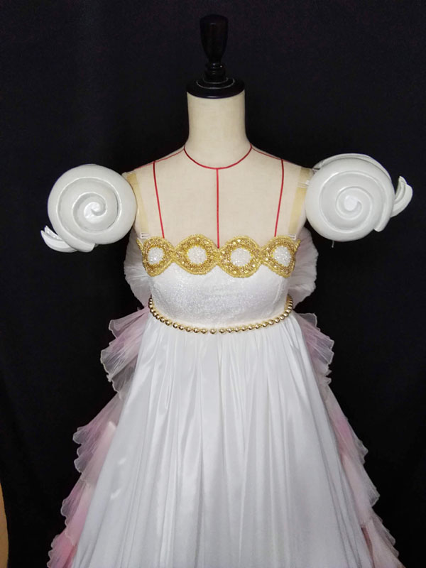 自分用アニメ版はこれで二代目?かな 少し光沢はあれどシフォンのように薄くてふわふわ、 原作版セレニティのつやつやドレスでよく使うサテンオーガンジーとは また違う質感のサテンです パールサテンだったかな(うろ覚え 後ろリボンはSSラストの伊藤さん風 ワッシャー的な生地をジーンズ染めQで適当にスプレーして グラデーションを出してみました 実はこの生地、中古ウェディングドレスの一部を解体してリメイクしました まだ残ってるからあと2.3個はリボン作れるかな もちろん中はふわふわひらひら お手製セレニティ専用ペチコート大活躍です 上部分はつやつや網掛けをコーティングして優雅さを演出 アニメ版は特にシンプルなのでこういう所で主張したい 実はこのセレニティちゃん、二年くらい前に一度作ったんですが 胸元の装飾が気に入らなくてずっと保留にしていた案件でした 今回久々に着る機会を頂いたので装飾をやり直し 左が調整後、右が調整前 キラキラのゴールドなメタルブレードを使ってみたくて一回目(右) だがしかしアニメ版だと中々しっくりこない 原作ならまだありかもしれないけど、 アニメ版は黄色みが強い方がイメージが合いそう そんな訳で作り直した二回目 オカダヤの新作ブレードが派手な金色でアニメのイメージにピッタリ☆彡 そこにビーズを飾ってスワロのストーンで煌きを追加 とりあえず納得しました かたつむりは我が家の造形担当の仕事 今までは布でなんとかぐるぐるを表現していましたが 個人的アニメ版のセレニティの肩は鎧のような硬さが欲しかったので 今回はスタイロで製作して貰いました 何気に今回がスタイロデビュー 石膏やパテよりもさくさく削れて成型は楽 しっかりコーティングをすれば強度もまずまずです 表面コーティングのテスト 田楽のよう そんな訳でイメージ通りのかっちかちな肩ができた訳ですが リアルに3次元で表現すると紙一重でいかつくて不格好になりそうな予感もします 腕の幅がどうしてもあるので真横が分厚くならざるを得ない 当方腕は平均より細い方ではあるのですが、結構な厚さの仕上がりです 試行錯誤は続くよどこまでも 次回予告 アニメ版セレニティコスレポ