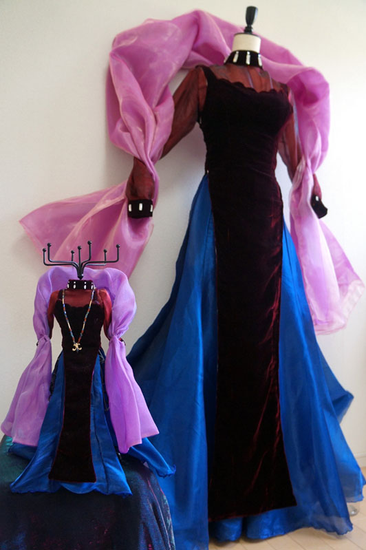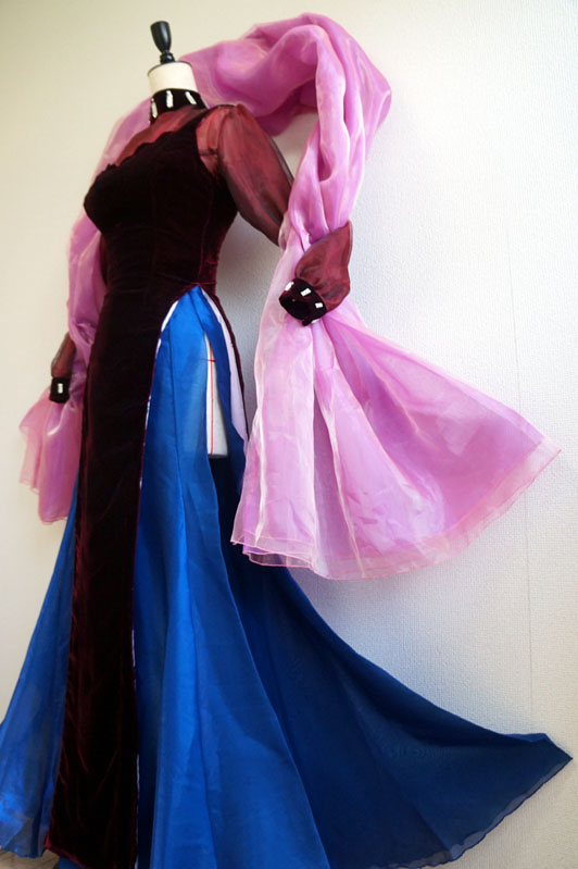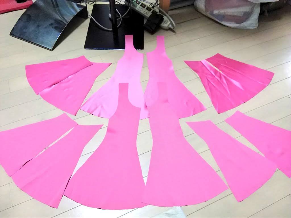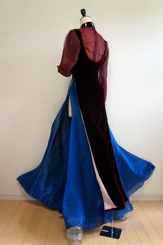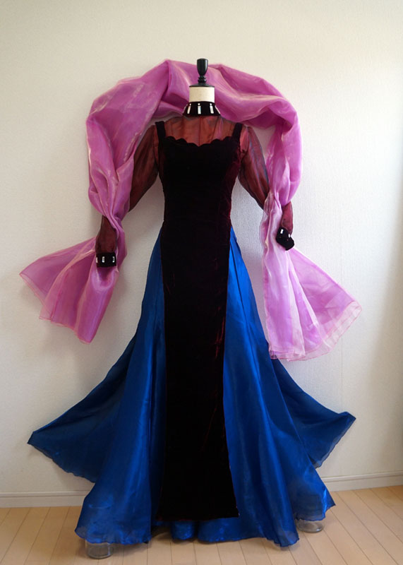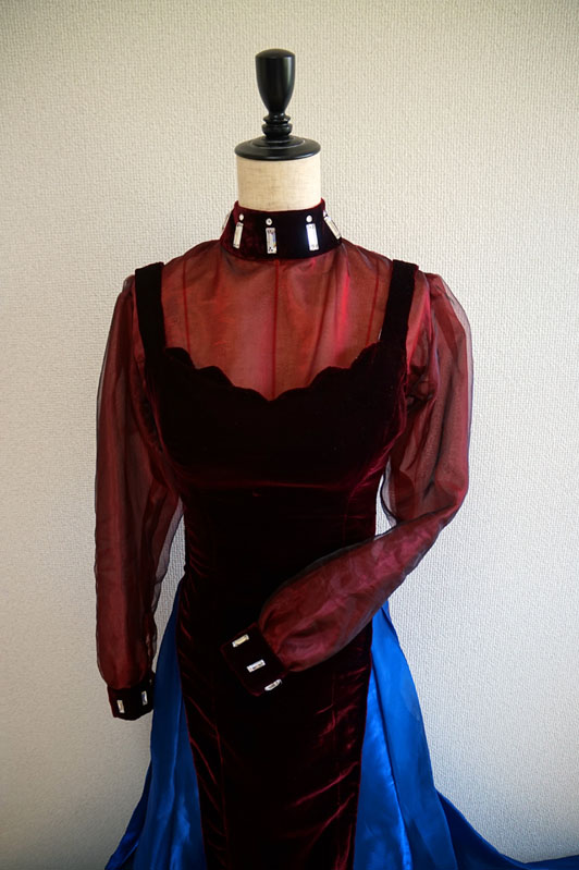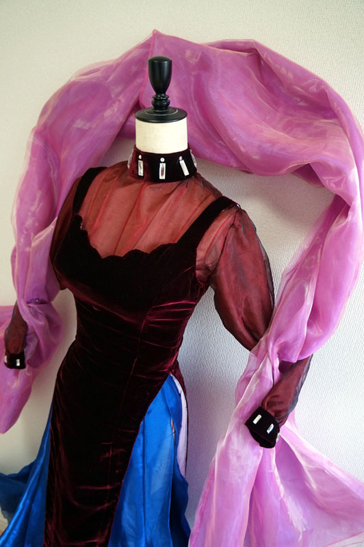 久々のとは何ぞやと言う話 実は今回でブラックレディは4代目 時代の節目に作り直す衣装となってます ブラックレディ4代目 生地集めに二年間(生地が高くて一気に買えない)を費やしやっと完成 本体ワンピのベルベットは毎度オカダヤ一択 全体は黒のイメージでハイライトだけエンジ色 この絶妙な色味がとても大事 他のベルベットだと赤みが強すぎてイメージが違うんです ワンピだけでメーター5000円を5m也 生地なんてセレニティに比べたら少ないじゃんと思いきや ベルベットは毛並みの方向性を揃えないととんでもない事になる案件 方向を合わせて型紙裁断しないと光の当たり具合でそこだけ何か色がチガウ! とか普通になってしまうんです怖いですねブルブル なので節約もできず非常に勿体無い切り方をするしかないんです分かりますか力説 ワンピースの裏地は設定通り勿論ピンク つるつるの表面とベルベットを合わせて縫うのが鬼畜過ぎて 半泣きになりながら朝まで縫ったのも良い思い出 時間があれば全部手縫いにしたかった位ミシン作業が辛かった ……ていうか完成してから結局周囲ぐるっと全部手縫いで調整しました 恐ろしい手間のかかるワンピ もう当分作りたくない 羽衣も二種のオーガンジーを重ねて色味調整 偏光の生地大好きマンなので中身は偏光オーガン 外側にツヤ足しで艶々のピンクオーガンをコーティング どっちもの生地もメーター約2000円を3mちょっと ワンピ生地と羽衣生地は同時に買うと即死案件 月を分けて上京の度に少しずつ買い足す方法を取る 値段のダメージがじわじわボディーブローのように足されていく ていうか羽衣に骨を入れて立たせようか悩み中 (撮影時はピンで壁に留めています) アニメの無重力感を出しても見たいけど このままふわふわもいいなあそんなジレンマ 首周りと手首のビジューはガラス製&スワロ使用 プラスチックと比べて輝き方が全然違ったので最早一択 値段はブラスチックよりは割高でありんす ブラウスのオーガンジーも茶色ベースに赤と黒の偏光生地で色を重ねました うん、この赤黒い偏光オーガンがまたとてもいい値段でね これも別日にじわじわ買いました ブルーのスカートもメーター1800円を7m ……買ったのに思っていたより足りなかった やはり10m買うべきだった後悔 今回作り直すにあたり、実はもう一段階過程がありました 数年前にスタンドで縮図の立体を制作 アクセサリースタンド~最恐コンビミストレス9とブラックレディ~ 生地は同じものを使用して質感を確認 スカートの型紙の形はここでイメージを固めました スタンドは全体のバランスを確認するのにとても良い勉強になります そんな訳で満を持しての等身大再現でした 実は準備期間がとても長かったブラックレディちゃん 執念に近い愛がこもってます イェェェィ さあここで突然の我がコスプレ人生を振り返り ブラックレディは毎回、自分の技術が上がった節目に作り直す衣装 遡ったら初代は2001年で、人生初めての自作衣装でした 何とムーンより先にブラックレディちゃんのウィッグを買ったんですよ ていうか4代目とか、一体何回作れば気が済むのかと ちなみに今回も納得する仕上がりにはなっていないので、 まだ作り直す事は出来ます 今回がゴールではない余白があるのは嬉しい事 セレニティは解釈違いで色んなパーツで永遠に何回も作って楽しいけど ブラックレディはまた違う感覚で何回も作り直しています セレニティはどのバージョンもパーツが違うからロケーションに合わせて 使い分けているけど、ブラックレディは新作作ったらもう旧作はお役御免 同じ生地を使用して何回もリメイクしています 作り直したい周期がきた時に新作が登場する仕組み ていうか19年後も作ってるとは……当時の私も思うまい この人まだ現役なんですよ まじか そんなこんなでセレニティとはまた違う愛の形のブラックレディ紹介でした。