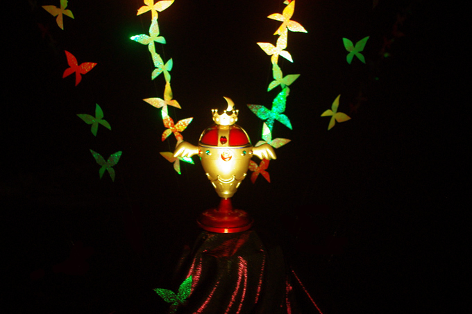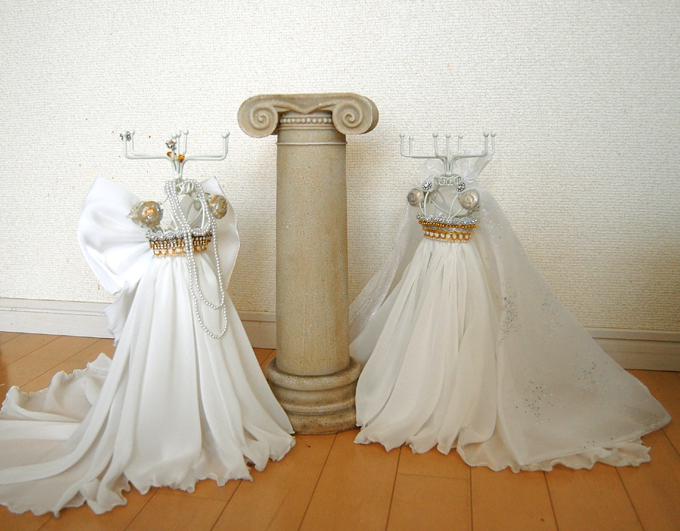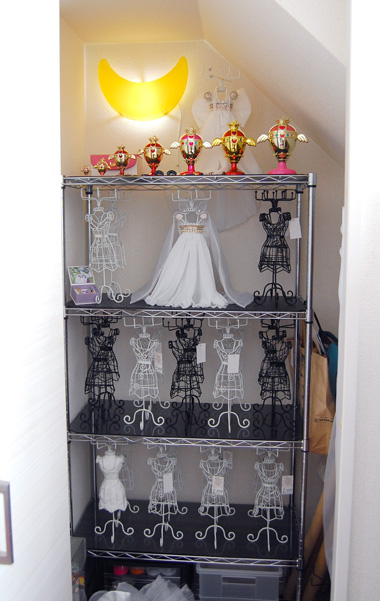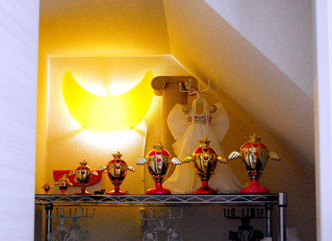アクセサリースタンドの、セレニティ! 持ち込まれたアクセサリースタンドを見た瞬間ビビッときてしまい 色々やりたい妄想が膨らんだのでそのまま勢いで20体程自分用に購入してしまいました 早速プリンセスセレニティを制作し そのままネオクインも完成 やばいこれはたのしい……たのしすぎる このまま色々作り始めるとあっという間に置き場に困る事になるので 布置き場だった納戸をスタンドルームに改装しました 仕事はええ 前にいただいた月の照明がやっと設置できてテンションアップ! 一気にセラムン感むんむんのムーン 丁度良い柱をゲットしたので飾ってニヤニヤ シルエットが正にセレニティですごくイイ 嗚呼加速する情熱にこの肌が色を変える 続いて次回の記事はスタンドの細かい解説でございます