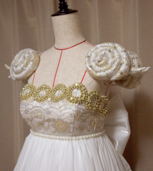 花嫁さんを送り出す母の気分になってほっこりと作業が進みます そんな一着が完成しました 今回は初のアニメ版ウエディング 胸の部分の装飾がシンプルに、そしてかたつむりもデザインが違います 原作よりいかつい感じ 装着位置も原作は腕上部ですが アニメ版は肩部分になり、まるで鎧のような仕上がりに かたつむりは奥が深い、もっと色々な作り方を追求していきたいです ウエディングドレス恒例のエンパイア 今回はアニメ版ということでスカート生地が三重です 透けないように土台のサテンに長さの違うシフォンが二重の構造 一番上のシフォンの丈はQ-posのセレニティの丈を参考にイメージしました スカートの生地は圧巻の45-50m とにかく裁断も大変で縫うのも大変 生地の海に埋もれながら工業用ミシンで一気に縫い上げていきます 後ろリボンの形は綺麗に作れたv(^O^)v ウエーブ巻ロックのなみなみひらひら具合も抜群の仕上がりです 胸部分もシンプルながらゴージャスに 豪華なブレードをめいっぱい使用してキラキラの輝きを出しています 三日月ぽいレースがあったので土台に重ねてみました 優雅! パールはアニメ版は金色ベースだけど今回は白色にアレンジしてあります 裾のひらひらウエーブは金の糸で豪華に 生地によってはなみなみ具合が綺麗に出ないのですが シフォンは相性が良いから抜群のなみなみになりました 手触りも最高 やはり高い生地は良い……