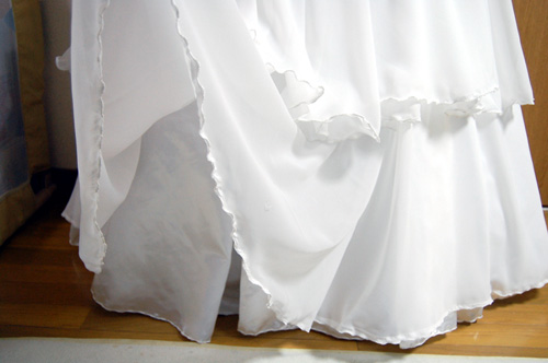 今回シフォン生地持込で制作したのですが ふわふわのシフォンがとてもマッチしていてかわええです(^^ ボディーもかたつむりもすべてシフォンでコーティング スカート部分は何気にめちゃくちゃ大変でした; 下地のサテンと同じ長さでシフォンも切ったのに 生地が微妙に延びてしまい丈が合わず; 結局トルソーに着せて揃えました もっと大変だった裾 シフォン生地が薄すぎて ミシンの押さえから逃げてしまい 上手くロックがかかりません。 裾の格闘だけで数時間(><) でも比べると分かりますが サテンはシフォンに比べてウェーブの付き具合が微妙でよく分かりません シフォンは薄くて柔らかい為かめちゃくちゃなみなみになりました 苦労したけどシフォンセレニティはかなりイメージが合いそうです |