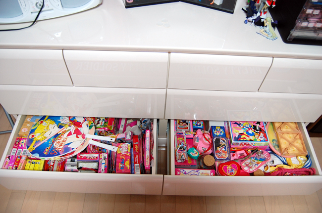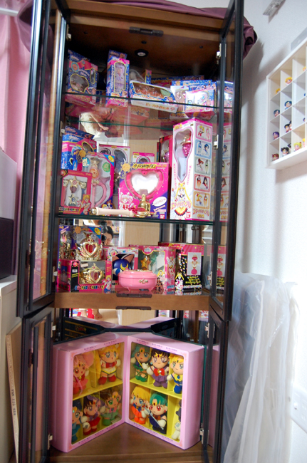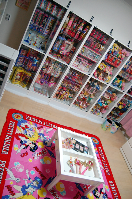 生活圏完成 図書室完成 そしてセラムン部屋も完成てすv 何ヶ月もかけてやるつもりたったけど 毎晩夜中まで没頭してやったら連休で終わってしまいました。 グッズの量が半端ないので片付くか心配だったけど 8.5畳+ロフト2畳+ウォークイン2畳で 広さ的には12.5畳あるので 結構余裕で収まりました(´▽`) 一番広くて一番日当たりの良い部屋なのに 保存状態を考慮して 遮光カーテンですべての窓塞ぐ予定です できたらそのうちすべての窓にUVカットつけたい なんというもったいない使い方w 特にお気に入りなのがコレクションキャビネット せらぬいとドールを中心に飾ったのですが 度迫力に壮v観v せらぬいは古い順シリーズごとに並べてあります この飾り棚も掘り出し物でした リサイクルショップで4万だったのですが 普通だったら10万は下らないものかと おもちゃを飾るときらきらしてステキすぎるv せらむんのイラストが載っているものはすべて捨てないでいたみたいで もはやゴミの様な物もたくさんありましたが 大事に飾り奉ってみました(笑) ガムの紙くずとか全プレの封筒とか ふりかけの袋なんて未開封で 感触が生ふりかけになっていたのですが 多分もとから生ふりかけだったんだと思います(ぇ ウォークインクロゼットには コス衣装にウィッグに小道具 きっちりおさまりました(^^ お部屋の全貌はそのうちセラムングッズHPにでも リニューアル版でアップする予定です イベント写真も一年くらい更新してないのに言うのもあれなんですが; B型はやる気さえ出れば早いので ある日いきなり大量アップとかしてるかもしれません 週末のガタケに合わせて