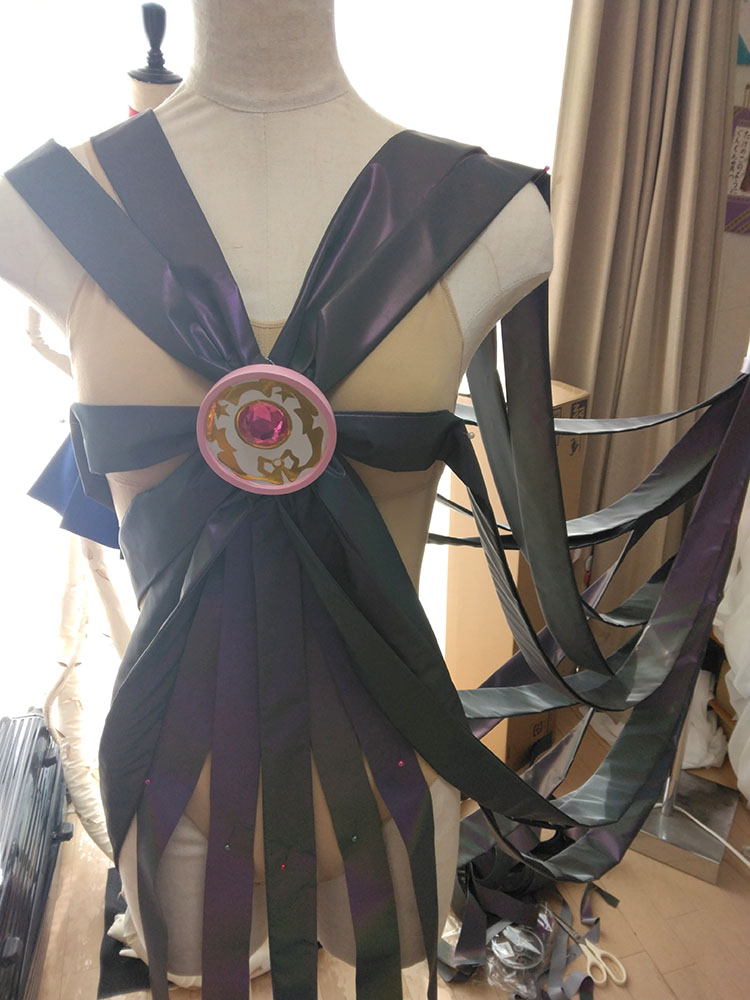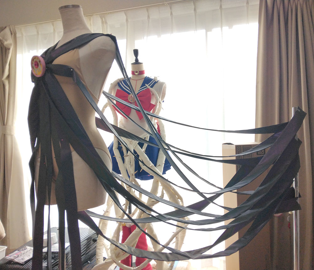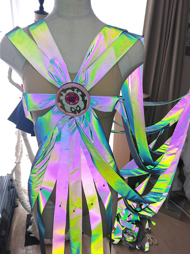 遂にリアル変身をすることにしましたイエーイ ムーンプリズムパワーメイクアップ! セーラームーン変身リボン こちら変身中としては二作目となります 初代変身リボン こちらは約30mのリボンを肌色レオタードに直縫いして制作 分解不可能で持ち運ぶだけで形が崩れるのが課題でした 今回の変身中は18mと量は控えめですが バランスよく調整してスマートにしました スナップで全部着脱可能なので持ち運びも超楽 やったね! そして大きな違いと言えば素材 オーロラリフレクターを使い、より変身ぽく見えるようにイメージしました フラッシュ直浴びでオーロラに光る反射板 それを金縁のワイヤー入りリボンに縫い付けていきます ポイントはちゃんと両面リフレクターで縫いこむことと それでも裏面はリボンの雰囲気を残しておくようにしたことです オーロラリフレクターは光ればきれいですが肌との共存まで考えると本当に難しい素材で 湾曲した裏面まで光るかは不明だったので 光らない部分も優雅に見えるよう、肉眼の美しさまで追求しこうなりました LEDの当てる位置を調整するとスマホでもこれくらいは光る だがしかしピンポイントの位置からでないと光らないので本当に難しい子です 手袋も作りました こちらもリフレクターは仕込んでますが、キラキラのリボンを表面に出しました どんな感じに写ったかなー! その答えはまたいずれ
