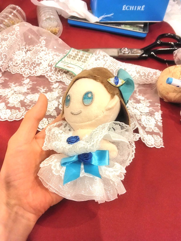 これは是非舞台上で動いている場面を拝見したい!と思い立ち馳せ参じてきました 生のお笑いライブ初めてだったのでめちゃくちゃ楽しみに行ってきました ワーイ! ありがたくもご招待券をいただき、とても見やすい席で最高だった 今回結婚式のコントという訳で、参列者も正装です ガチのフォーマルドレスだよ!(親戚のおさがりでこれしか持ってない人) ウェルカムボードも置いてある徹底っぷり セレニティのミニチュアが感動です ミニチュア作家さんのお手製とのことですが うちの等身大のセレニティドレスとパーツを合わせてくださっててとても嬉しい 胸元のパーツも再現度が素晴らしく 後ろリボンもオーロラの生地を重ねてくださってる! うんうんわかると握手したい(ガシッ イベントは最初から最後まで笑いっぱなしでした! テレビでよく見てた吉本新喜劇のノリそのままで 見たことあるネタも満載で安定した面白さよ 寿司のくだりで芸人さんたちが次々にネタを出していく場面がテンポ良くて これぞお笑いだなと感動しました あと個人的に笑ったのが、披露宴司会役の藤崎マーケットさんが 「ドレスはご友人のうさこさんの手作りです」と紹介してくださって そこは一人で手を叩いて喜んでましたwワーイ! 撮影タイムにて 今回動画の動くセレニティドレスを拝見できたのが個人的に超ありがたかったです 客観的に眺めることができて、どこをどう改善したらもっと優雅に見えるかすごく勉強になりました 特に今回前半のお式のパートではワイヤーパニエを着用し 後半の披露宴ではパニエを脱いだ状態で出てきてくださったので どちらの全体図も見せていただき勝手に一人俺得でした ワイヤーパニエは立ち姿には強いのですが、座ると形が崩れるのが難点で 座りのシルエットを考慮するなら絶対布量の暴力で膨らませた方がいいというのが私の信念 それが理想通りの柔らかさで、やはり布量大事だなとしみじみ 裾を捲って歩くと中が布でふわふわしてるの そうそれ、分かる! そしてもうね、胸元もキラッキラなんですよ きっと舞台上で光るハズと信じて一つずつオーロラのビジューを手縫いしていったのですが とてもとても報われてました わざわざファミレスまで行って、スポットライトに当たった雰囲気を確認して イメージをしつつ進めていったんですよ とても報われたヒャホー 友梨さんも頭小さいしスラッとして超細いので ドレスのラインがめちゃくちゃ綺麗に出てて手を合わせて拝みました お土産でいただいたステッカー 今回友梨さんの吉本新喜劇のキャラクターができたらしく とてもおめでたいですおめでとうごさいます! 恰好もセレニティぽくてさすがです(笑) 素敵な記念イベントの手助けができて嬉しかったです。 貴重な経験をありがとうございました!