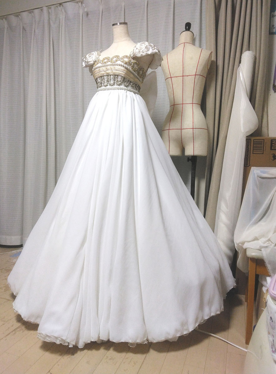 今回は面白いお話をいただき、作らせていただきました 吉本新喜劇の谷川友梨さんの芸歴20周年単独イベントにて結婚式の劇をするとのことで セレニティドレスで式を挙げるのが夢だったからドレスを作って欲しいと伺い 何それすごい面白そうと二つ返事で受けさせていただきました(毎度二つ返事の人 全てのセレニティ制作においてそうしていますが 実際お会いしての打ち合わせの他に、我が家で採寸&フィッティングもさせていただきました ぴったりに仕上げるために絶対必要な過程なんですこれが 今回舞台の上で使用するので、色々な構造を特に念入りに考えました 安定してズレないドレスの内部構造、動きやすさ、動画のシルエット、 裾のひらみに照明があたった時の煌びやかさまで頑張って考えました いつも全力だけど、20年間のドレス制作の集大成みたいな一着になって達成感半端ない あまりの達成感に、普段あんまり思わないようにしているのですが 大変満足してしまって一瞬魂が抜けてしまいました 私の人生独学で、一人でドレス作れるところまで行き着いて 明日事故で死んでも仕方ないくらいには良い人生であったと思います(走馬灯 いやもうちょっと生きたいけど!セレニティ今年あと二着は作るしw やりたいことあり過ぎてまだ死ねないので、頑張って生きます かたつむりは腕も上げやすいように肩部分で固定 ビジュー手縫いでひたすら縫い付けた甲斐があり、舞台の上でキラッキラでしたヤッター スカートも100m程布は使用しているのでそのままでもふわふわですが 歩きやすさを考慮して今回ワイヤーパニエを内蔵 既成のパニエが短かったので、布を足して全体の位置を下ろし ゴワゴワのハードチュールはシルエットが崩れるので敢えて外し ワイヤーのラインが浮き出ないよう、サテンオーガンジーでコーティングもしました 見えないのに高い生地でコーティングするのが私のやり方(笑) 柔らかい生地の質感は、絶対表に反映するんだそうなんだ (家にある置いてある生地がいい生地しかなかったから、これを使うしかなかった裏話) この内部構造も経験積み重ねてここまでできるようになりましたワーイ すごく安定して全然ズレません ファスナーでセパレート分割もお手のものです スカートガンガン洗濯機で洗っちゃえ~ かたつむりは毎回最後に悩まされる、永遠の課題なのですが 最近作っているラインはまあまあ気に入ってたりします 鎧みたいな解釈で、造形ぽく硬い素材で作るのも有りだと思うのでまだまだ色々作りたい 無限大の可能性を秘めているセレニティ、追及の旅はこれからも続く 次回 谷川友梨さんのイベントレポに続く!